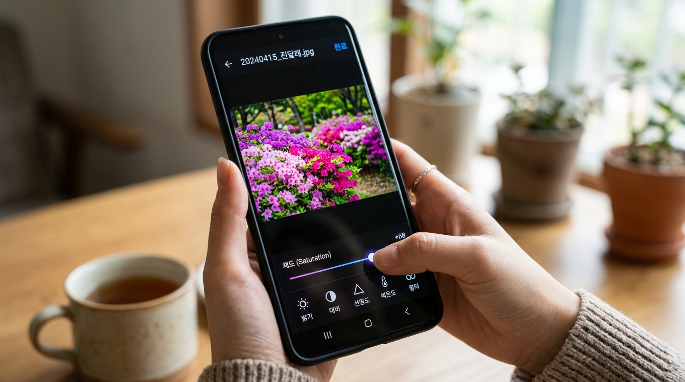 잘 찍은 사진도 보정 한 스푼이면 '작품'이 됩니다. 진달래 사진은 특히 '마젠타(Magenta)'와 **'밝기'** 조절이 중요해요.