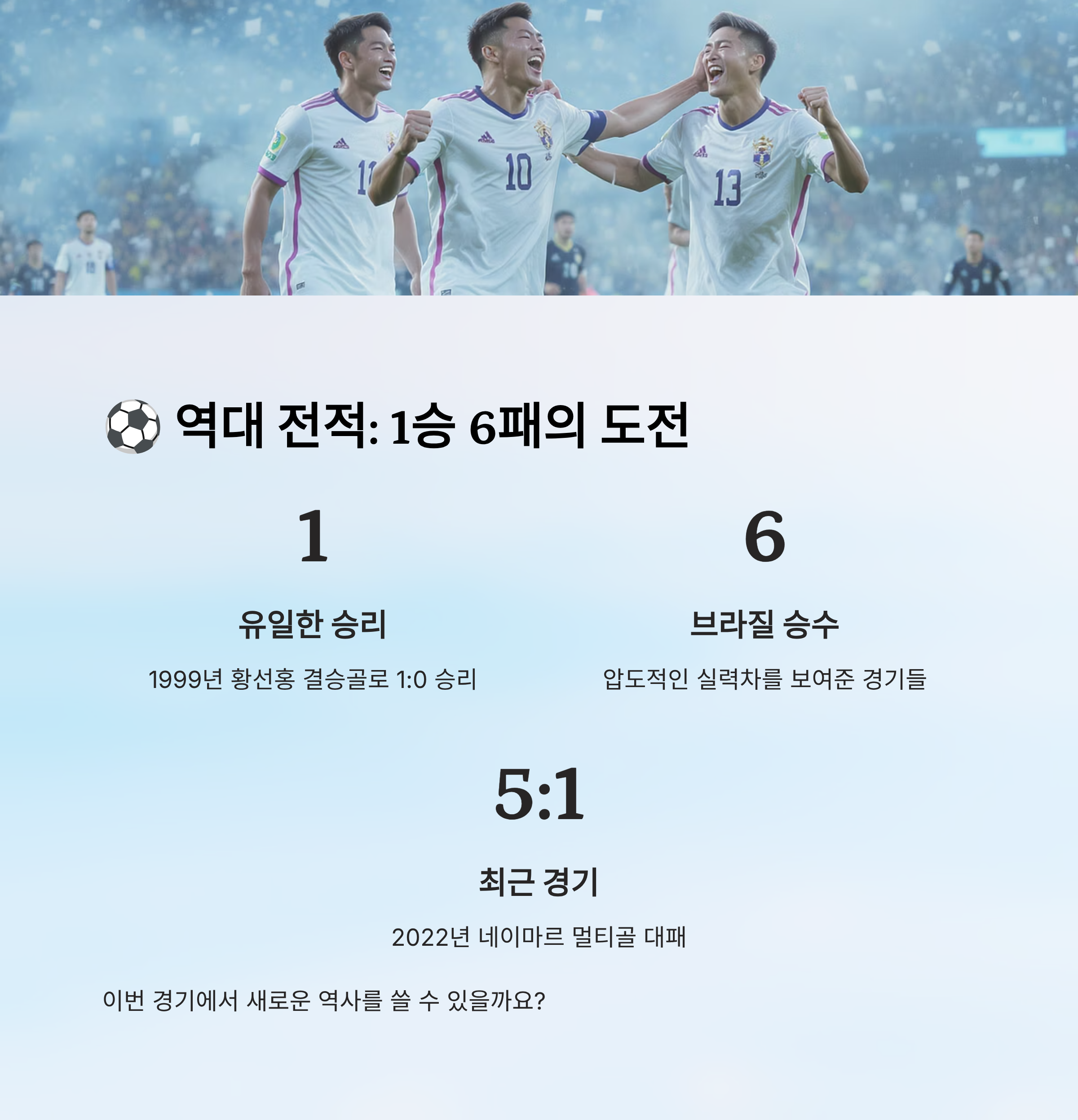 내가 생각했을 때, 이런 전적을 떠나 중요한 건 이번 2025년 경기에서 새로운 역사를 쓸 수 있는 기회라는 점이에요. 이번 경기를 통해 대한민국 대표팀은 강한 도전자로 다시 한 번 도약할 수 있을 거예요! 💪