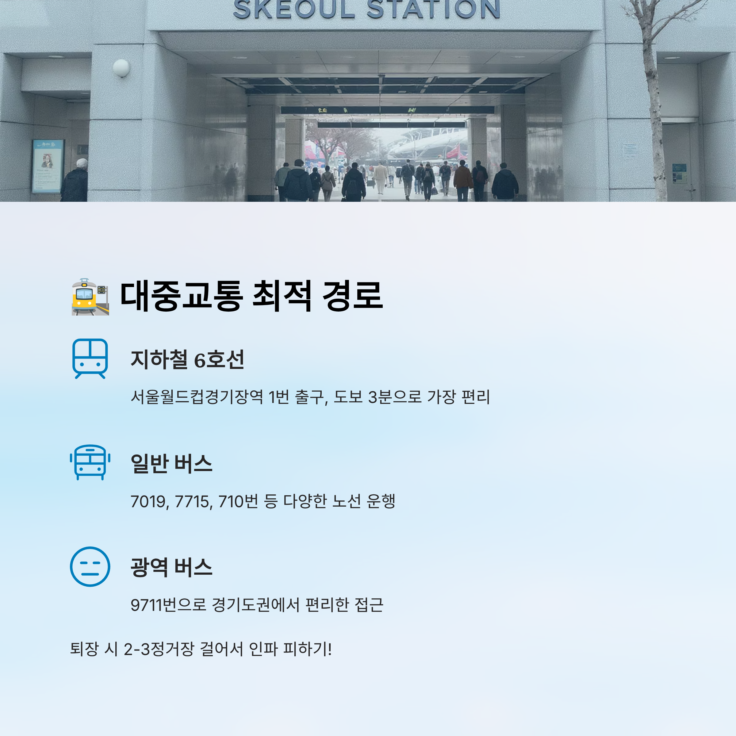 | 일반 버스 | 7019, 7715, 710 등 | 하차 후 5~7분 | 경기장 정류장 혼잡 |