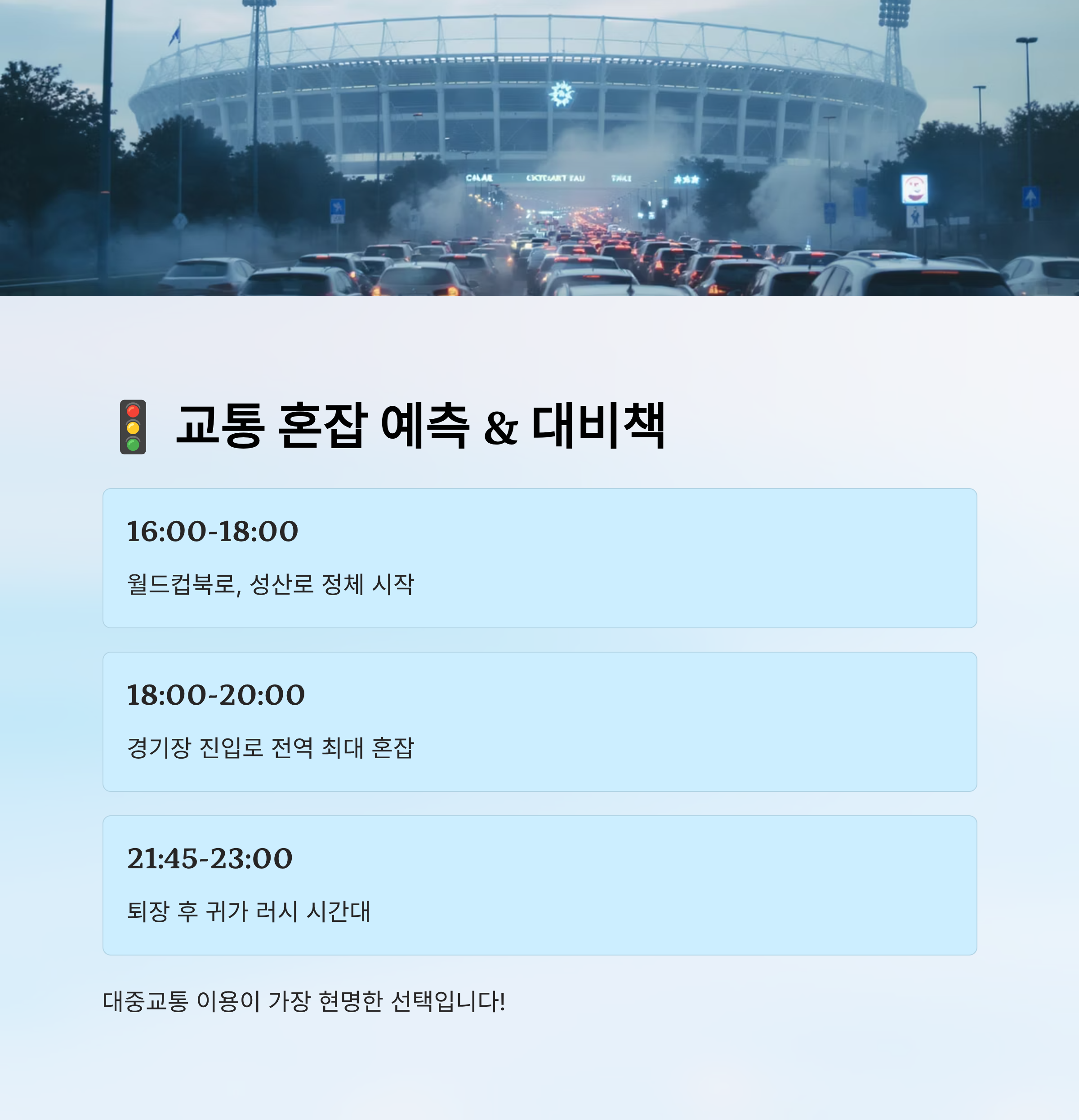 경기장 주변 도로 중 가장 혼잡한 구간은 월드컵북로와 성산로 일대이며, 상암 MBC 앞 교차로나 DMC 홍보관 부근은 특히 진입이 어렵답니다. 대중교통 하차 후 도보로 경기장까지 이동하는 게 훨씬 빠르고 스트레스도 적어요.
