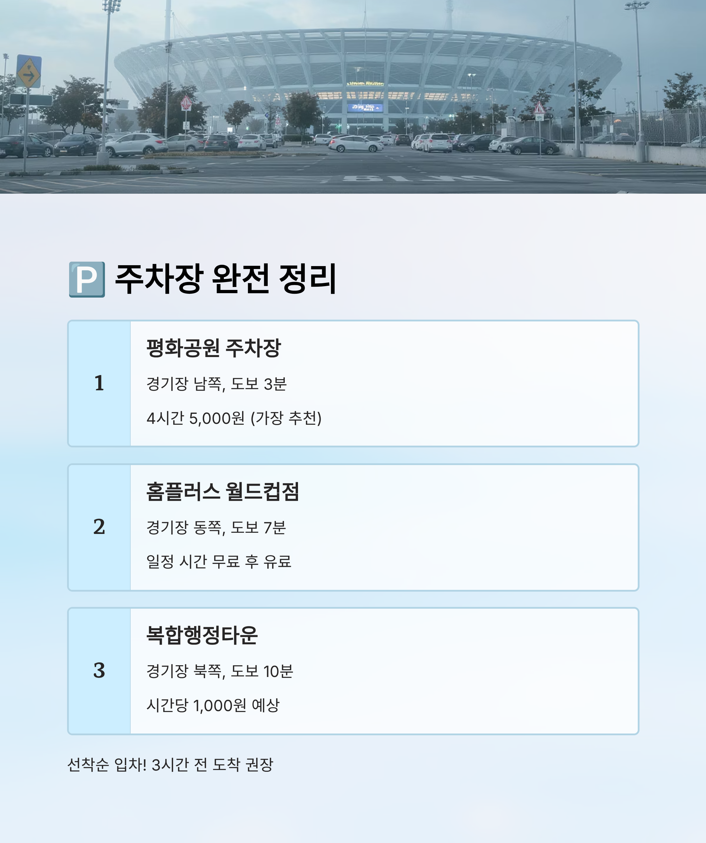 모든 주차장은 선착순 입차이기 때문에, 경기 시작 3시간 전까지 도착하는 것이 베스트예요. 하지만 가능하다면 대중교통을 선택하는 게 시간과 체력을 아끼는 최고의 방법이에요! 🚶♂️🚈