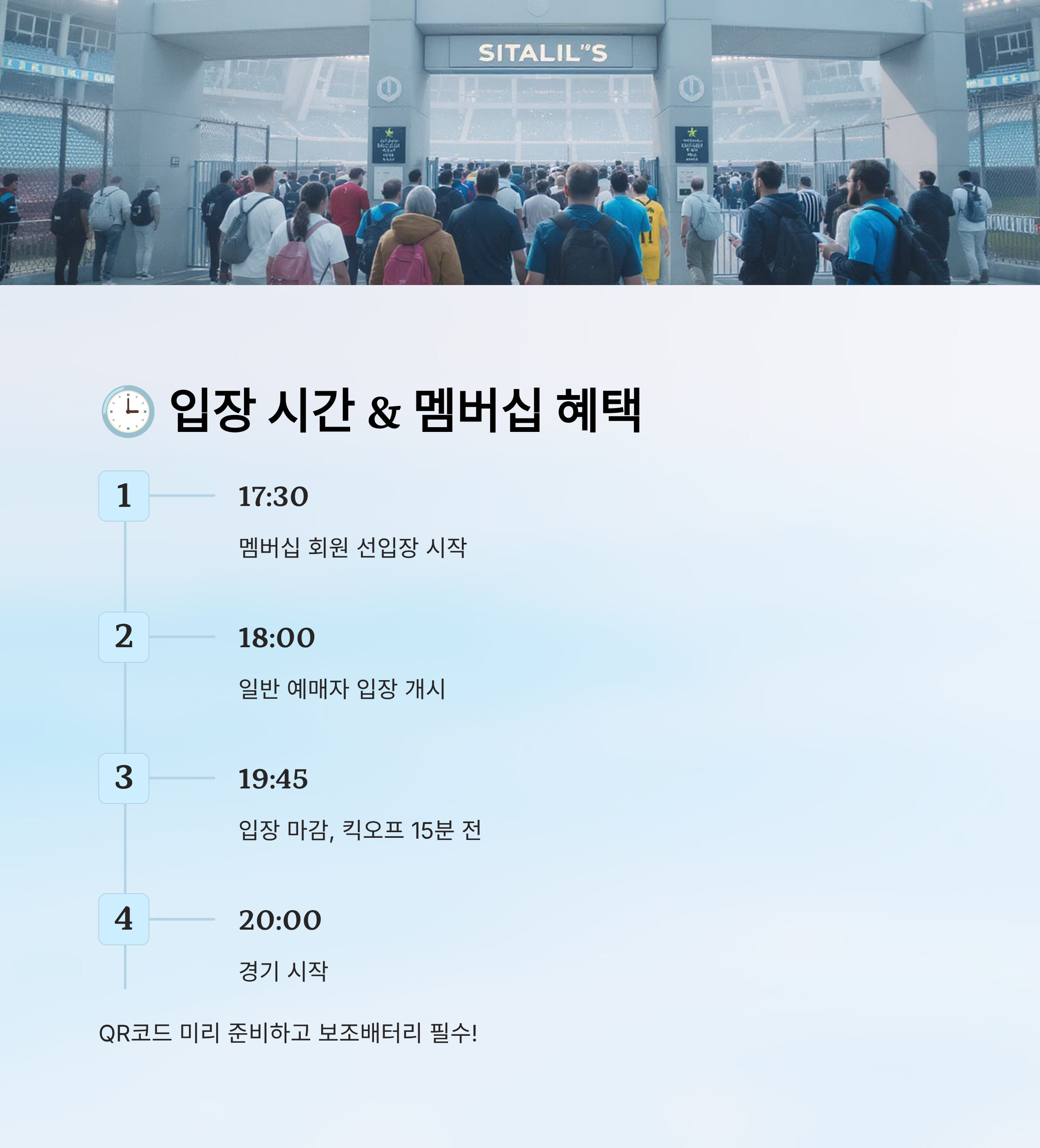 기억하세요! 입장은 빠를수록 유리하고, QR코드 확인도 미리 해두면 실수할 확률이 줄어요. 티켓팅을 성공했다면 입장 전략도 꼼꼼히 준비하는 것이 현명한 팬의 자세랍니다! ⚽🎫