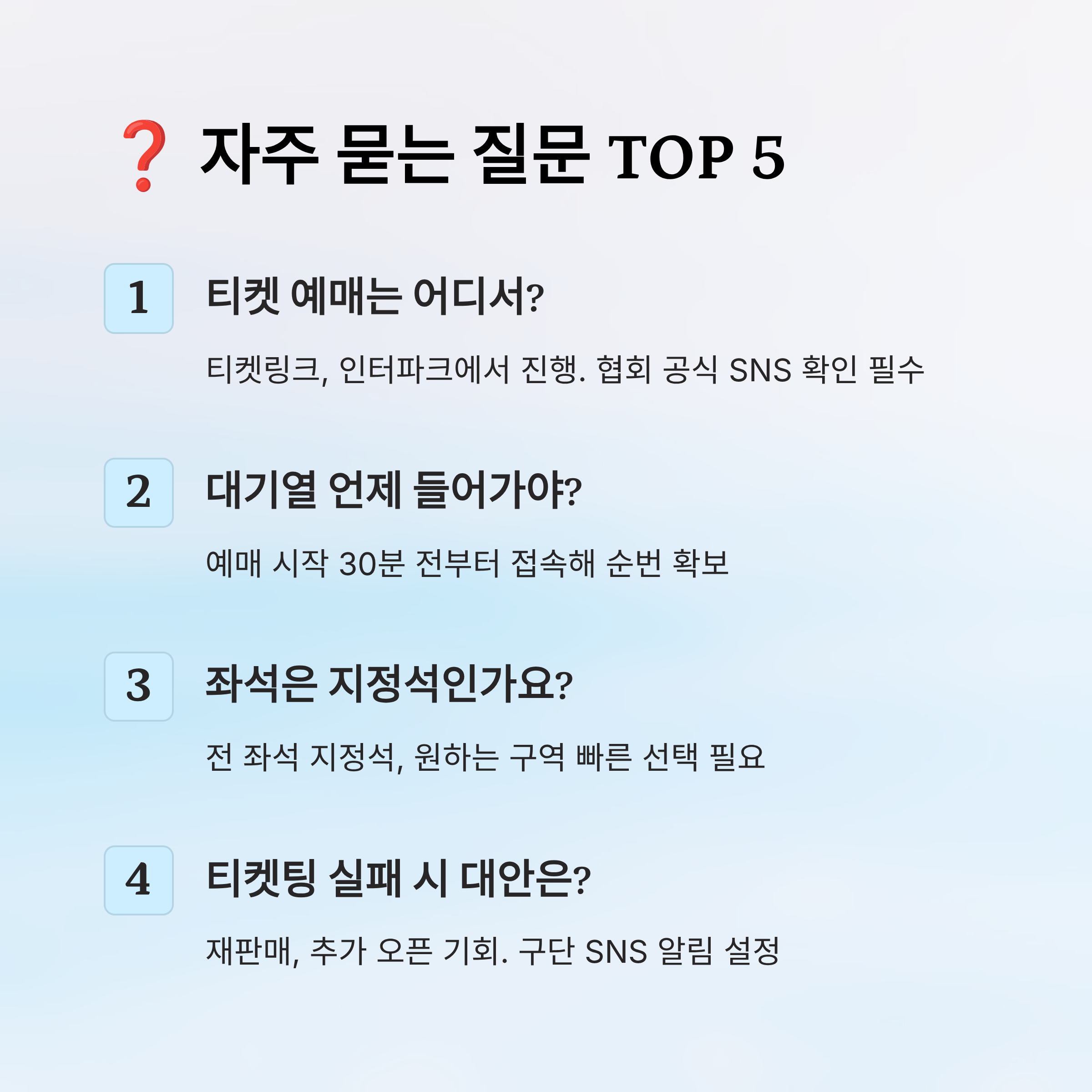 A8. 간혹 재판매 또는 추가 좌석 오픈이 생기기도 해요. 구단 SNS 알림을 켜두고 예의주시하면 기회를 잡을 수 있어요!