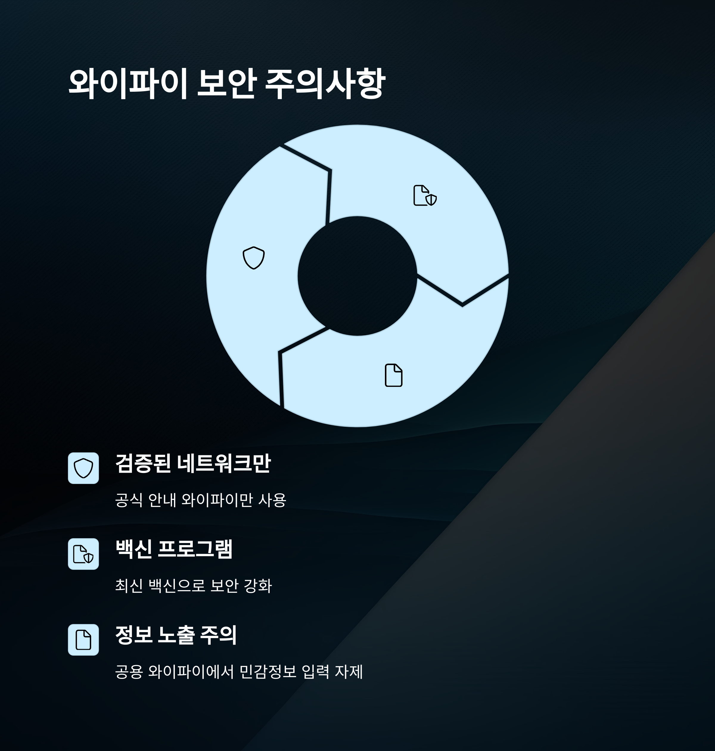 또한 비밀번호 없이 아무나 접속 가능한 와이파이도 피하는 게 좋아요. 이런 네트워크는 해커들도 쉽게 접근할 수 있기 때문에 정보 탈취의 위험이 커요. 커피숍이라도 인증 절차가 있는 와이파이를 사용하는 게 안전해요.