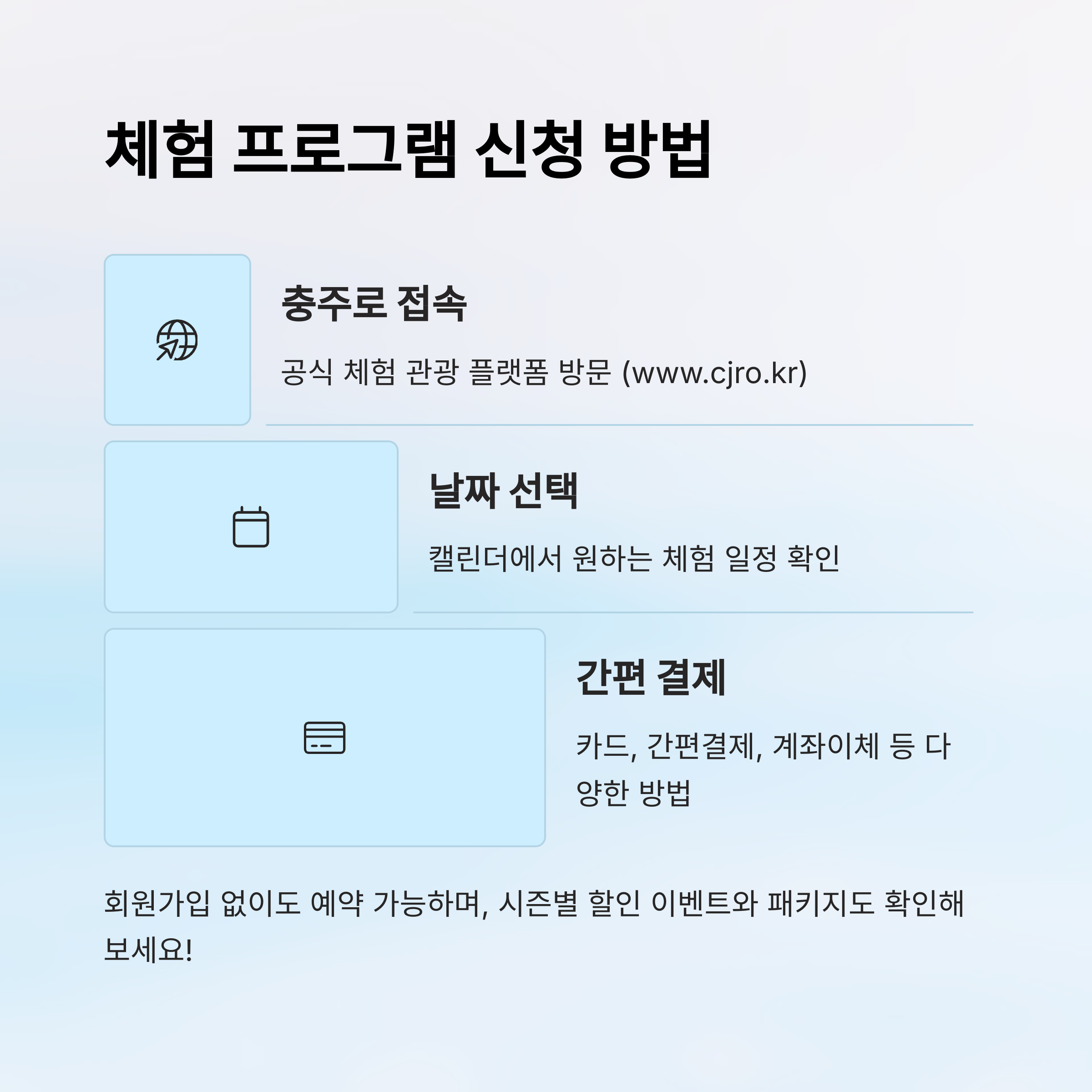 충주의 대부분 체험지는 현장 접수도 가능하지만, 인기 체험은 예약이 빨리 마감되기 때문에 충주로 사이트를 이용해 미리 일정을 확정하는 것이 여행을 더 여유롭게 만들 수 있는 방법이에요. 아이와 함께하는 가족 여행일수록 예약은 필수랍니다 😊