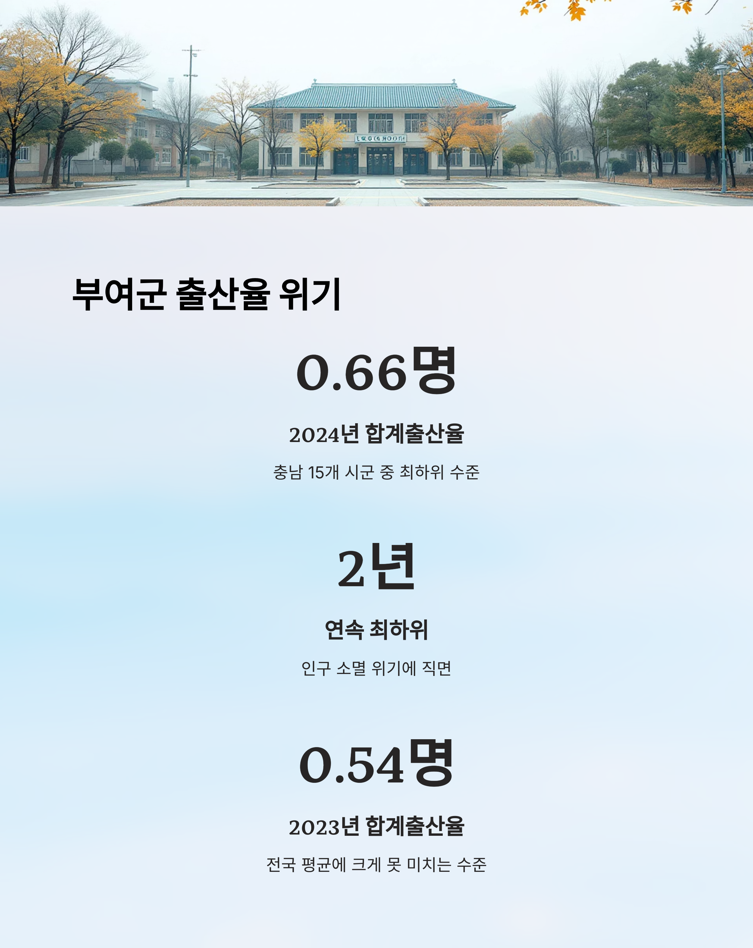부여군은 최근 2년 연속 충남 15개 시군 중 출산율 최하위를 기록하면서, 인구 소멸 위기라는 심각한 문제에 직면했어요. 2023년 합계출산율은 0.54명, 2024년에는 소폭 상승해 0.66명이지만 여전히 전국 평균에도 못 미치는 수준이에요.