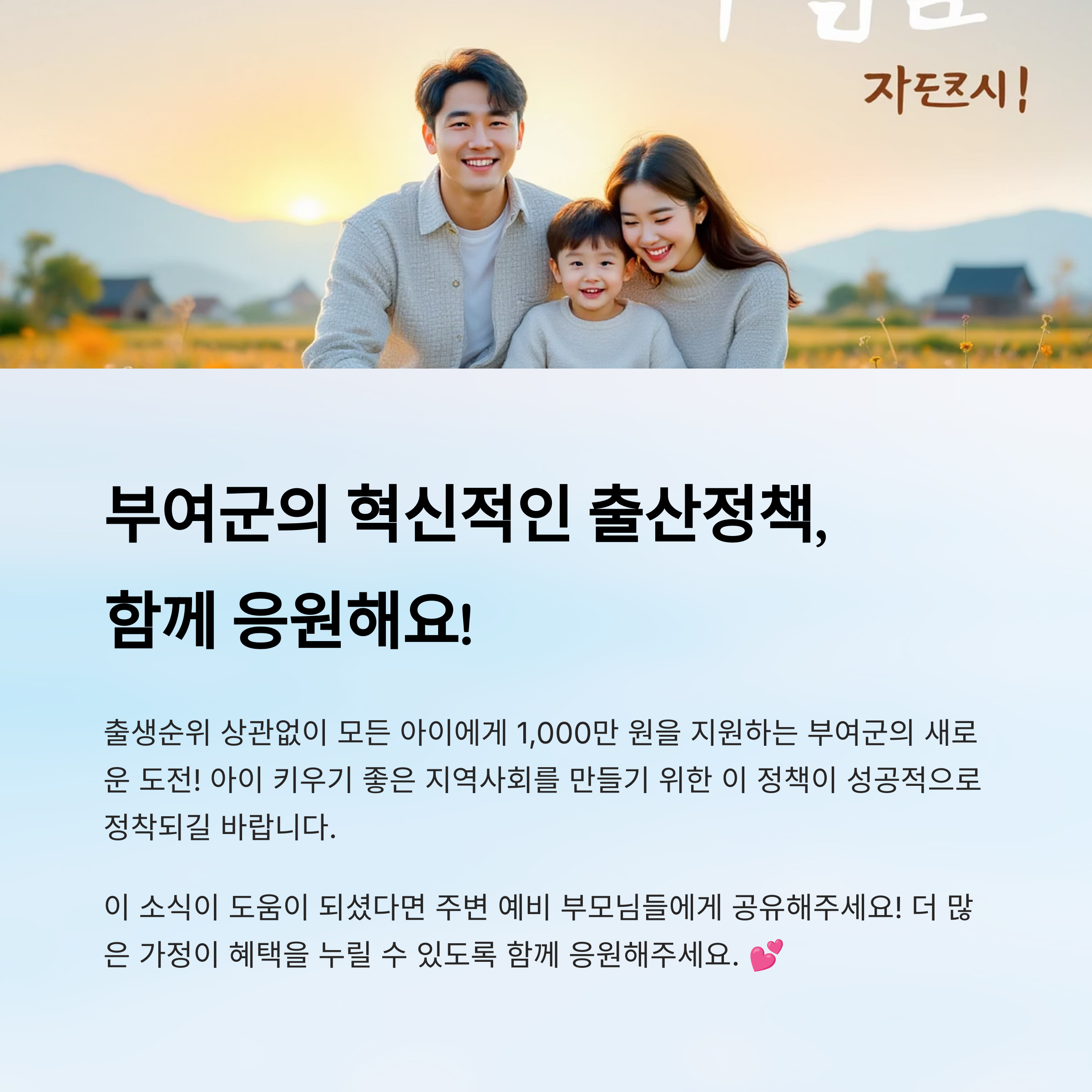 내가 생각했을 때 부여군의 이번 정책은 단순히 아이를 낳게 하기 위한 목적보다도, 아이가 태어난 후 안정적으로 자라날 수 있는 환경을 먼저 조성하려는 방향이라 더 현실적이고 따뜻하다고 느껴져요. 💖