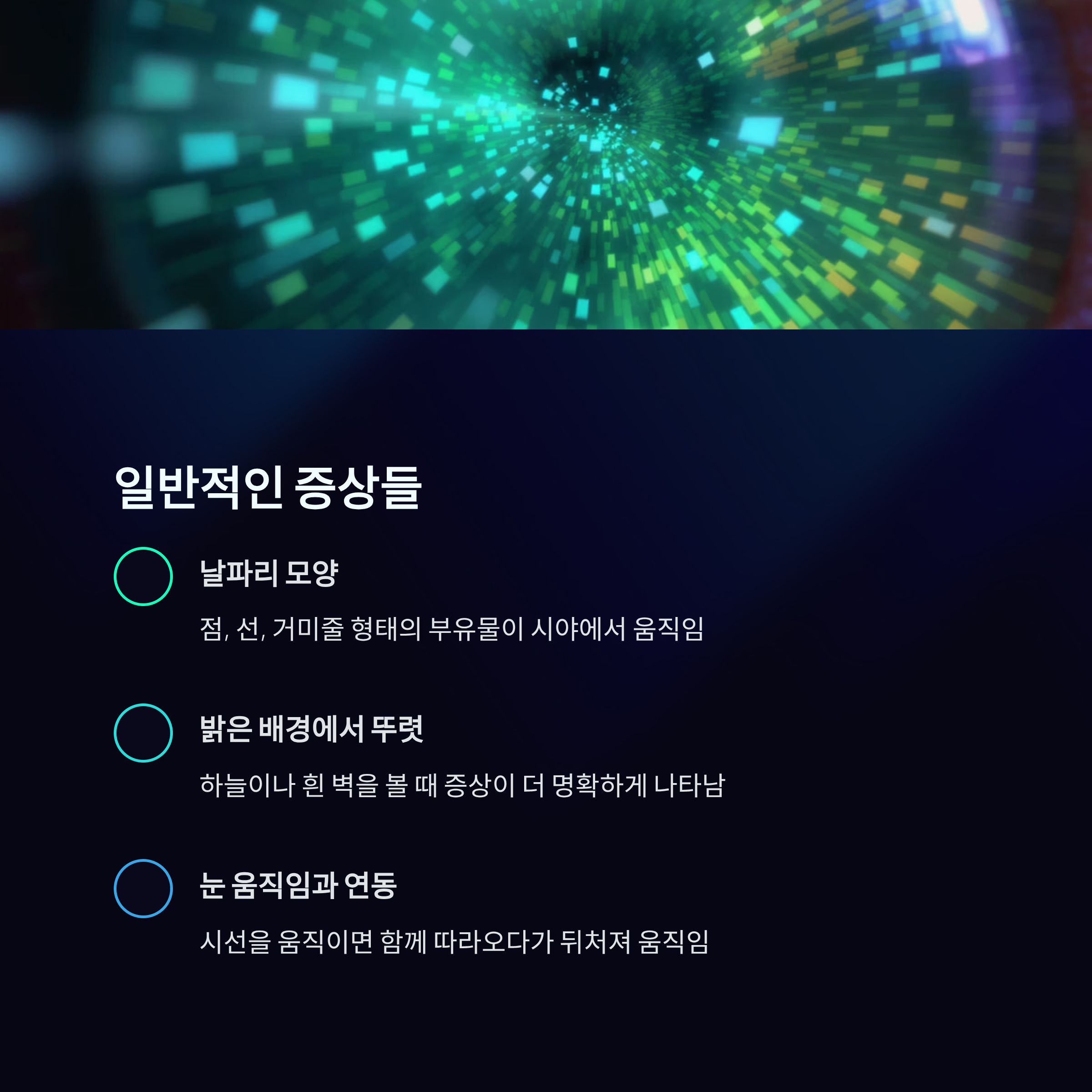| 날파리처럼 보임 | 점, 선, 실 형태 부유물 | 낮음~중간 |