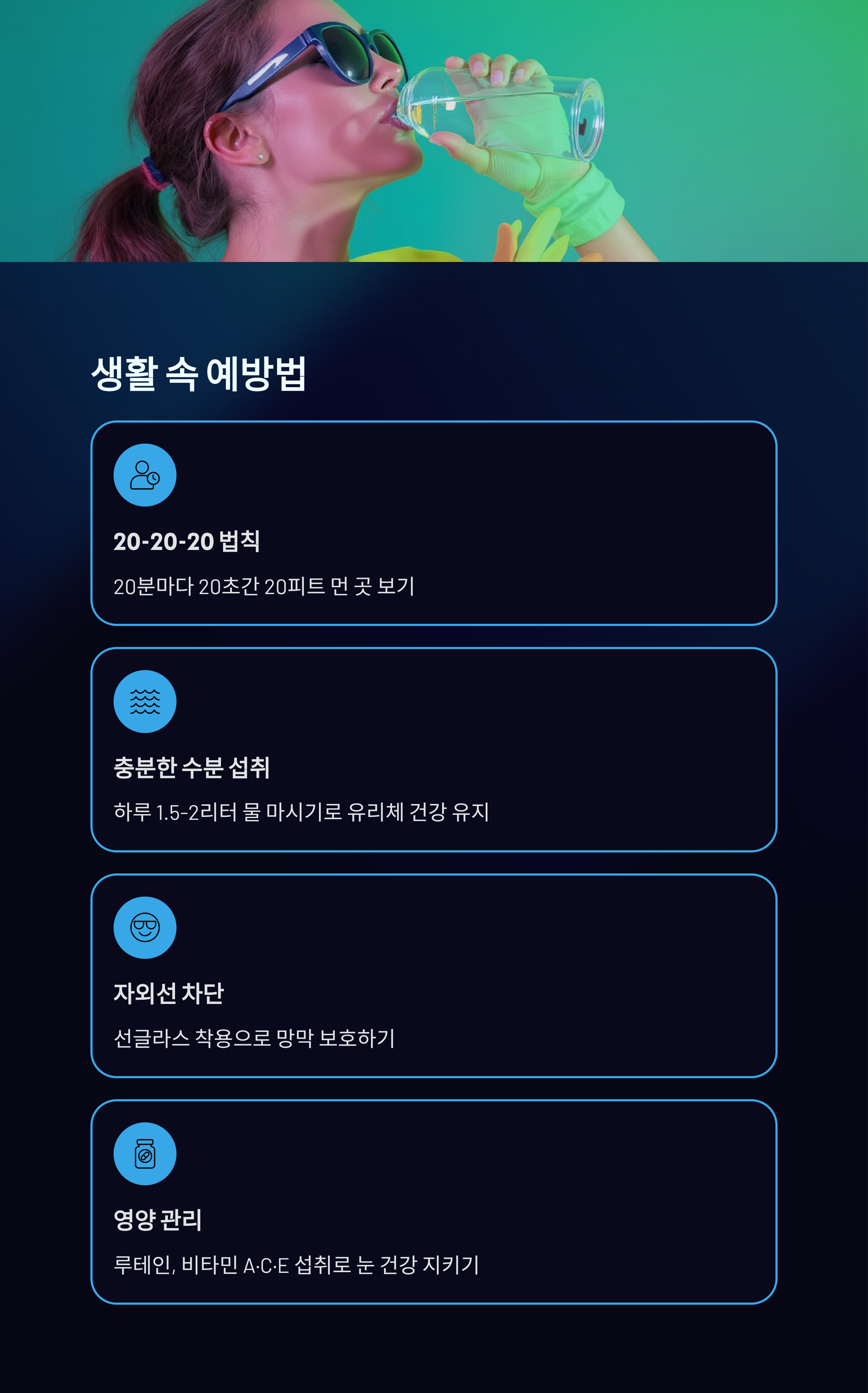 둘째, 적절한 수면과 수분 섭취도 중요해요. 수분이 부족하면 눈 속 유리체의 점성이 변해 부유물이 생기기 쉬워요. 하루에 물을 1.5~2리터 마시는 습관은 눈에도 좋아요.