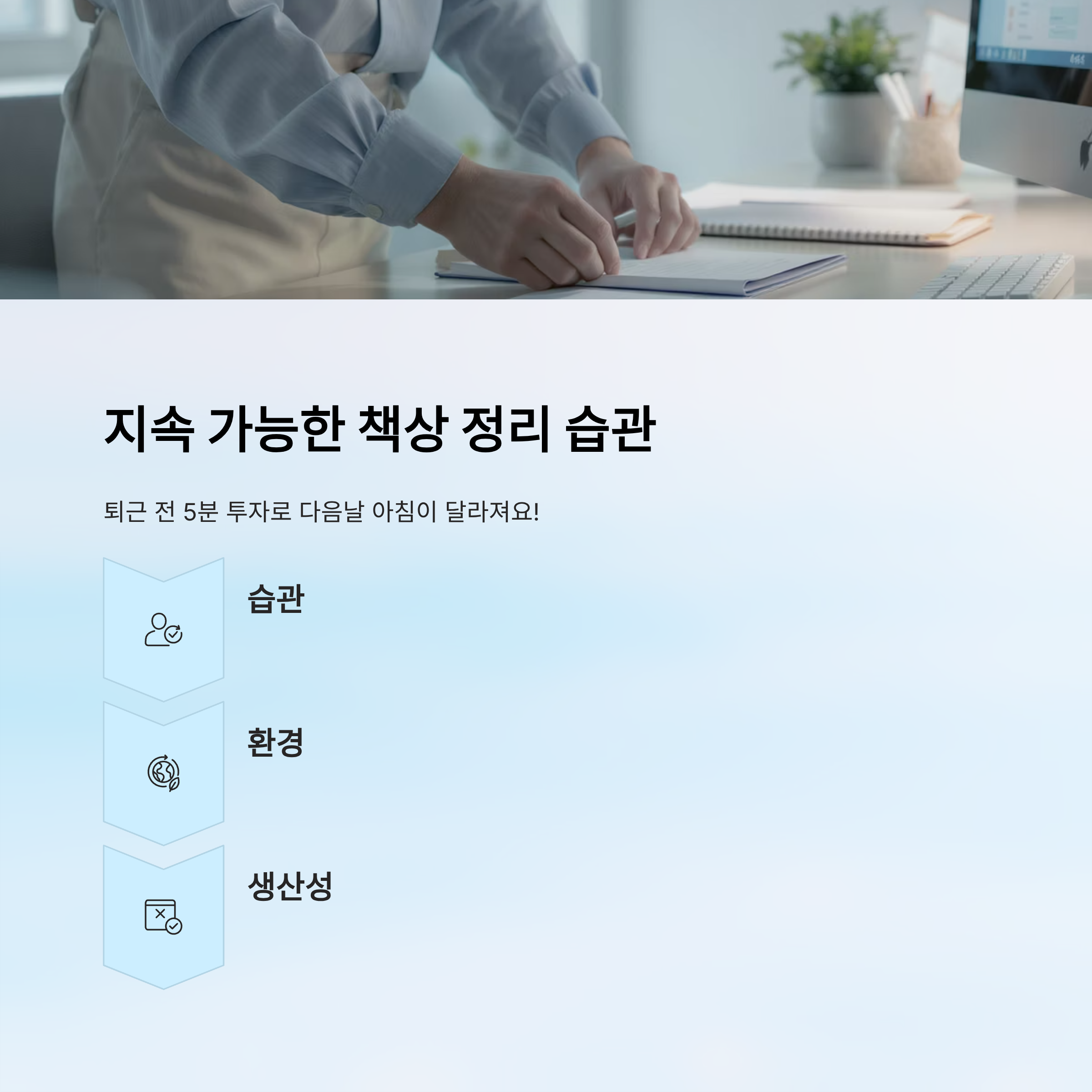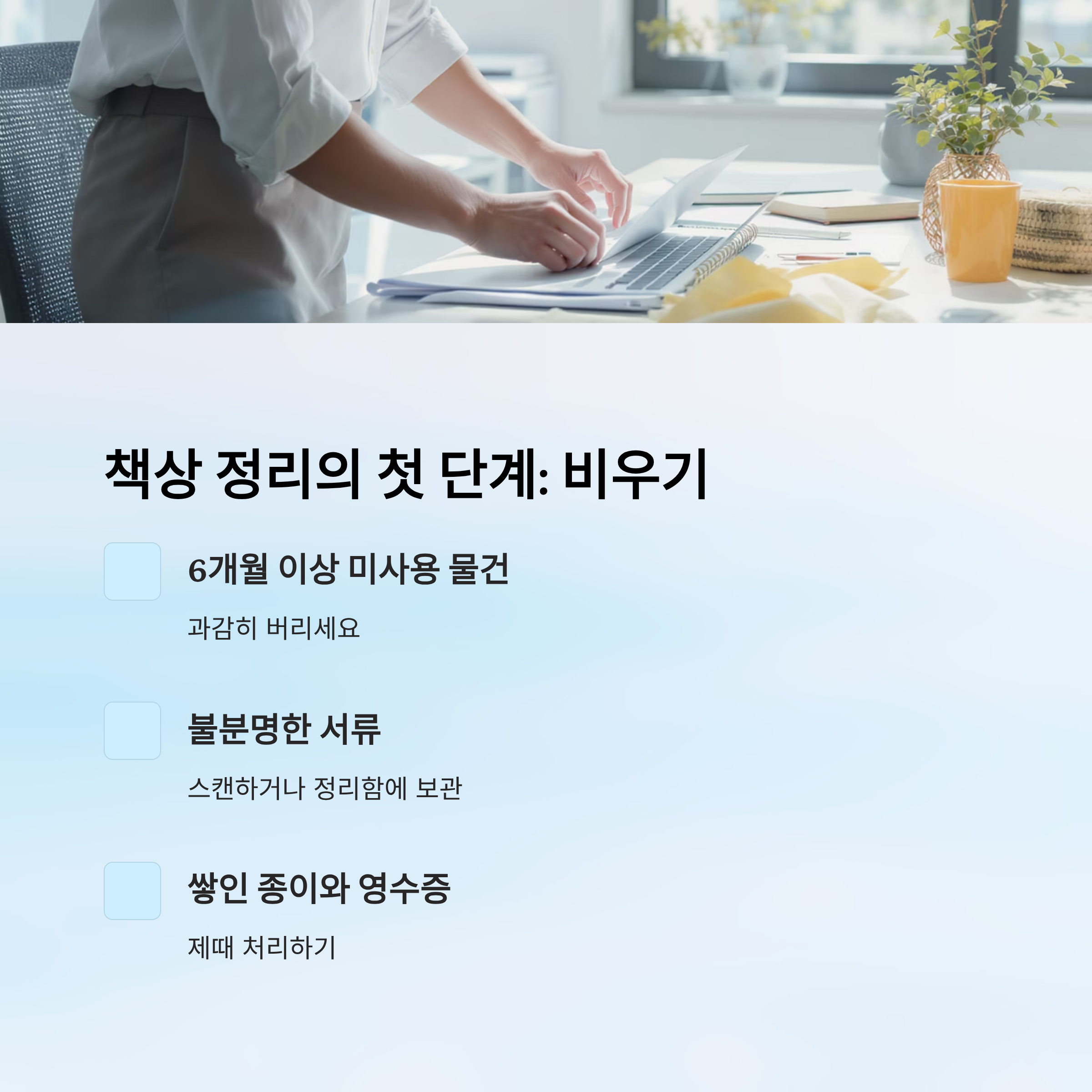 가장 중요한 건 '비우기'입니다. 당장 필요 없는 물건을 과감히 치우고, 꼭 필요한 물건만 책상 위에 두는 것이 첫걸음입니다.