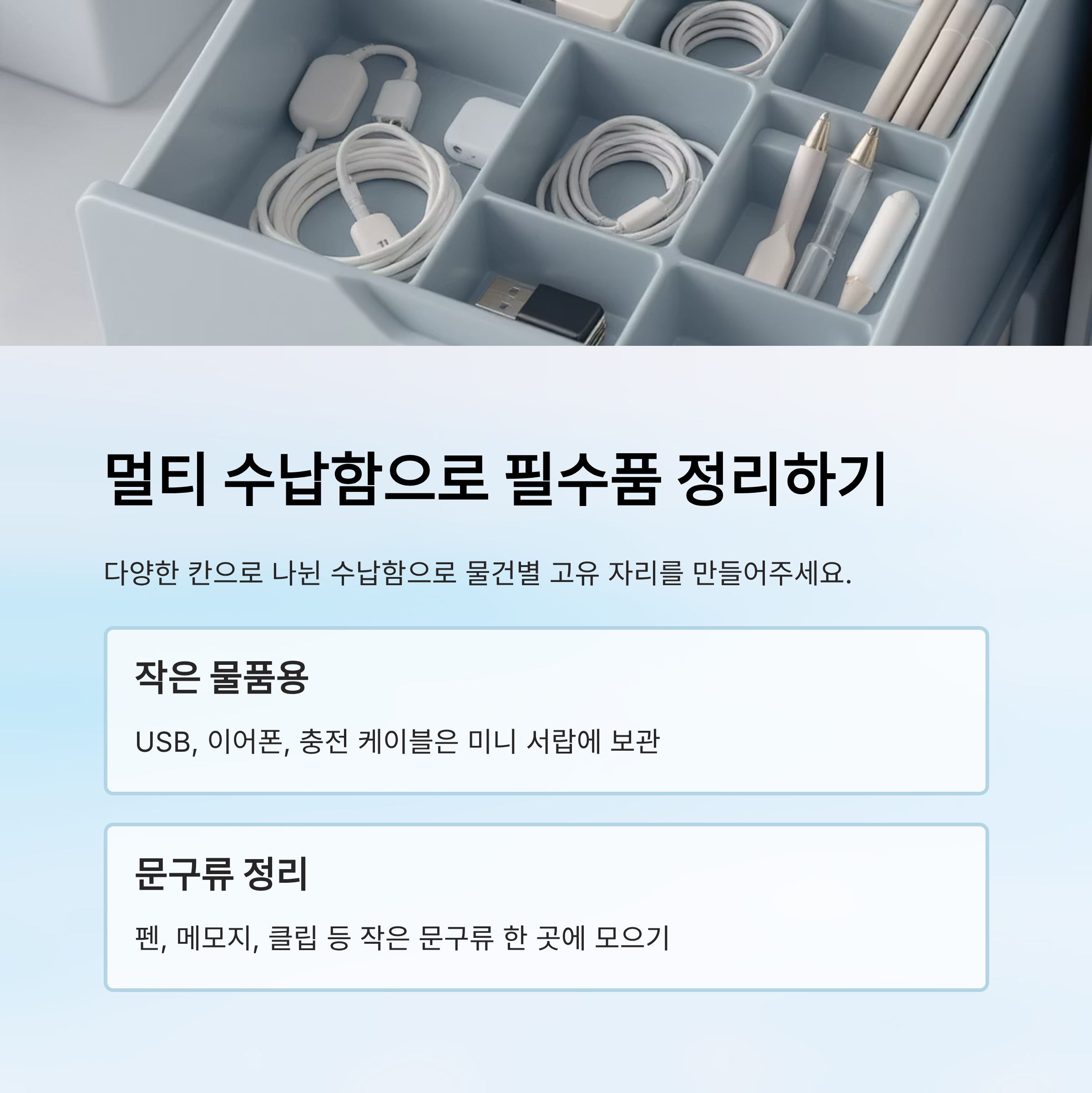 이제 이들을 효과적으로 정리해줄 멀티 수납함이 필요해요.