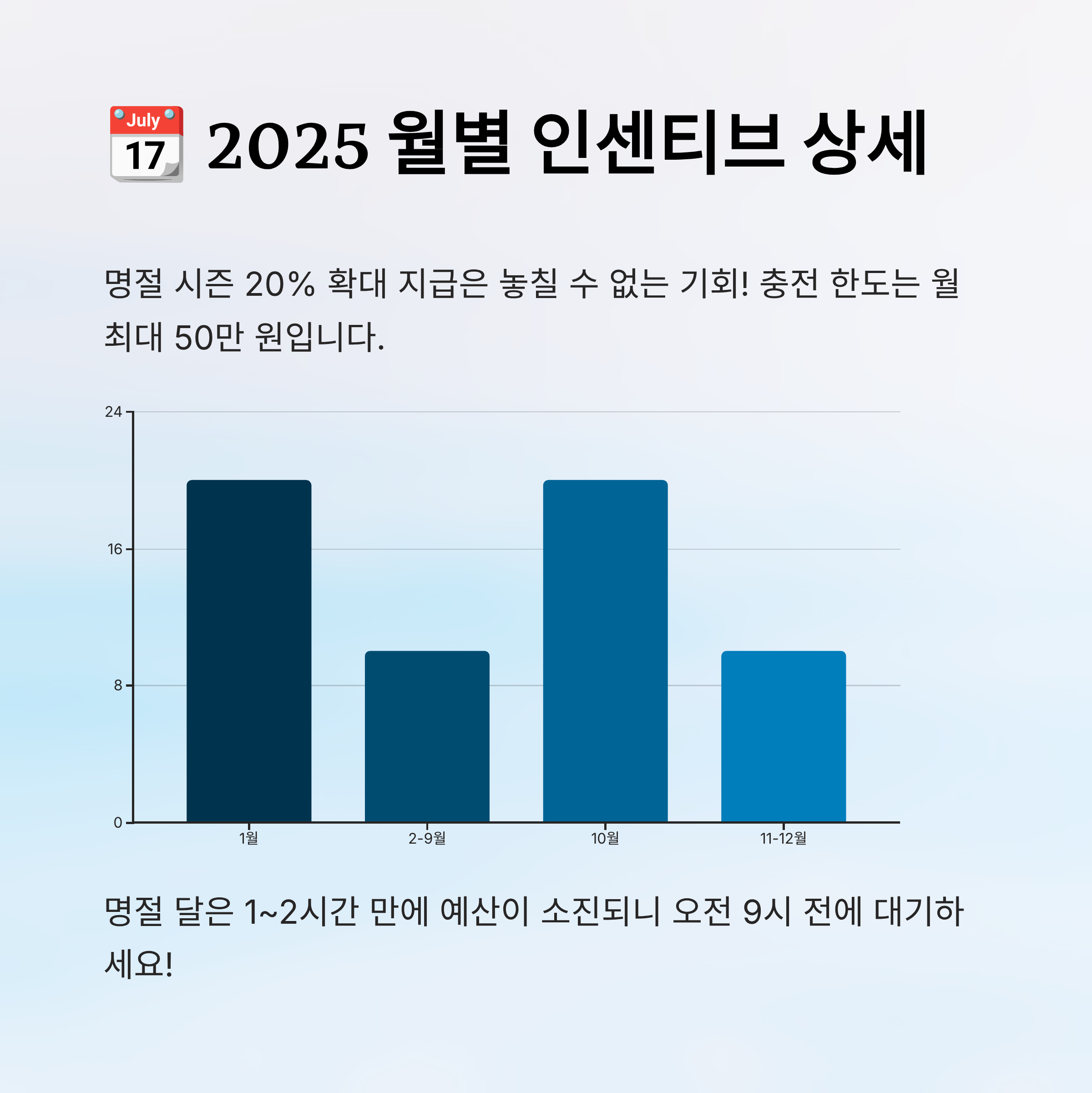 예산은 소진 시까지 지급되기 때문에 매달 1일 오전 9시에 예산 소진 속도도 다르답니다. 특히 명절이 있는 달은 단 1~2시간 만에 예산이 끝나기도 하니 절대 놓치면 안 돼요!