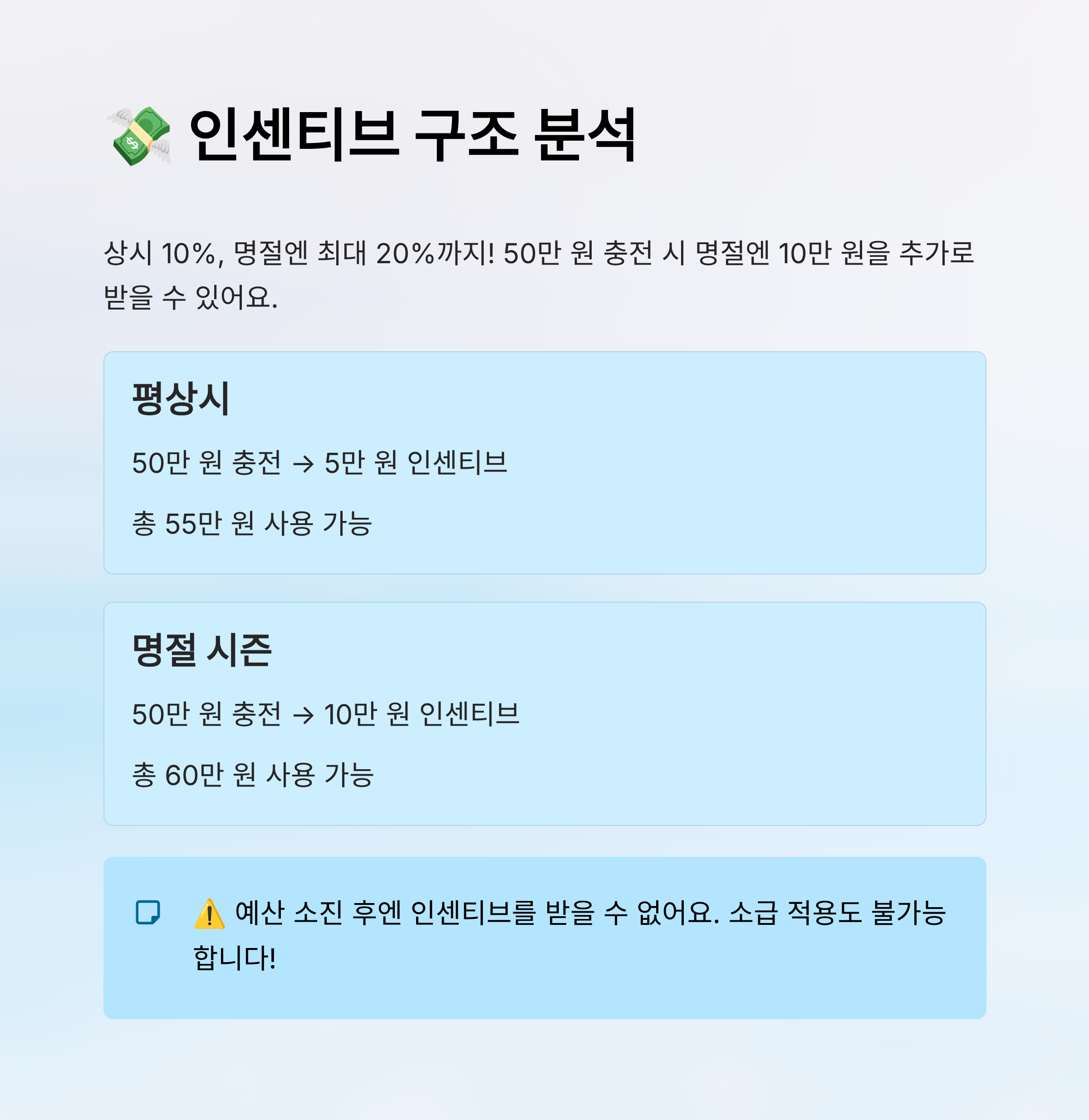 예를 들어, 평소에 50만 원을 충전하면 5만 원이 인센티브로 추가돼요. 명절에는 무려 10만 원까지 받을 수 있어서 실제 사용할 수 있는 금액은 60만 원이 되죠. 😲