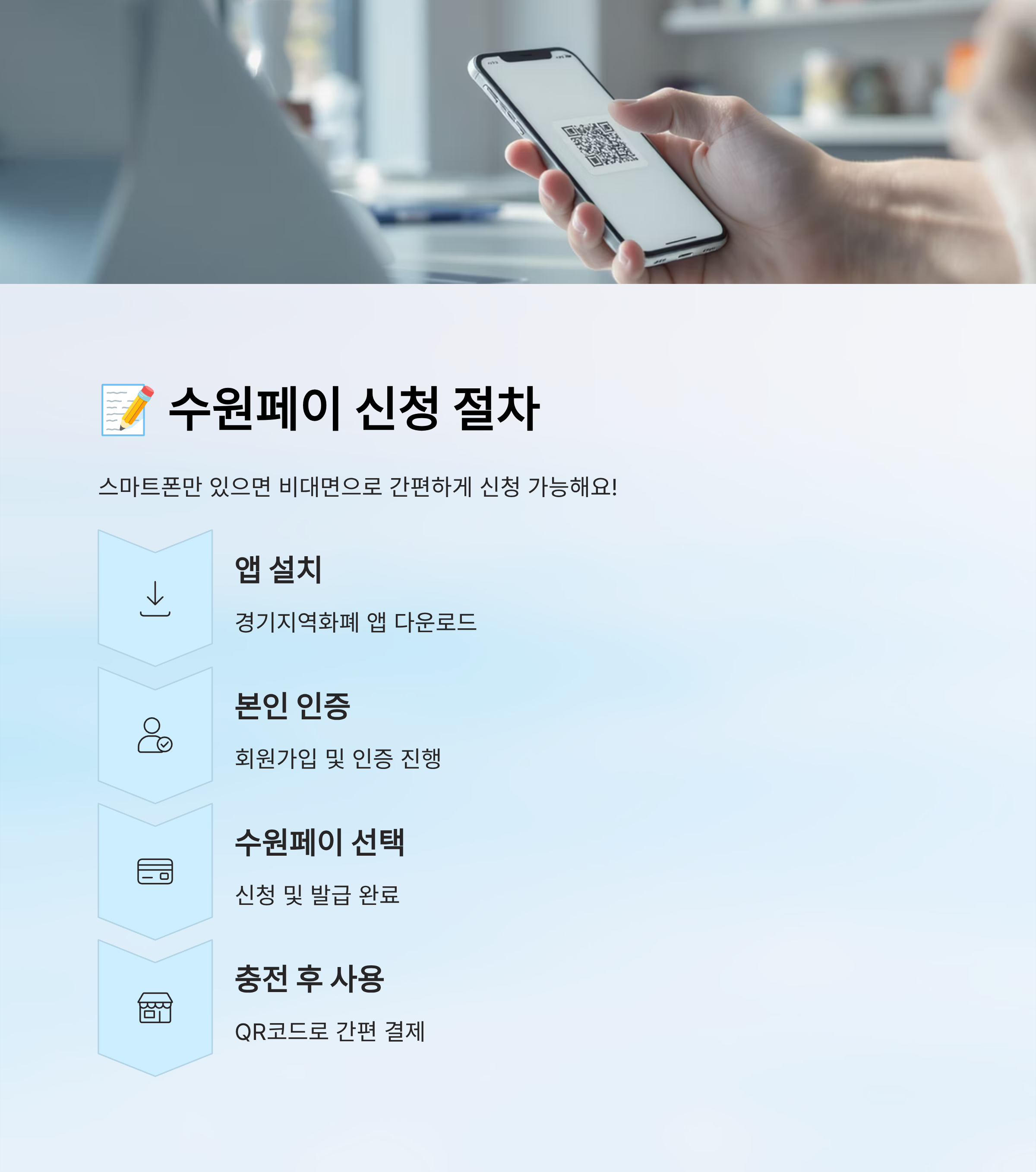 먼저 앱스토어나 구글 플레이에서 ‘경기지역화폐’ 앱을 설치하고, 회원가입과 본인 인증을 진행하면 돼요. 이후 ‘수원페이’를 선택하면 신청 완료!