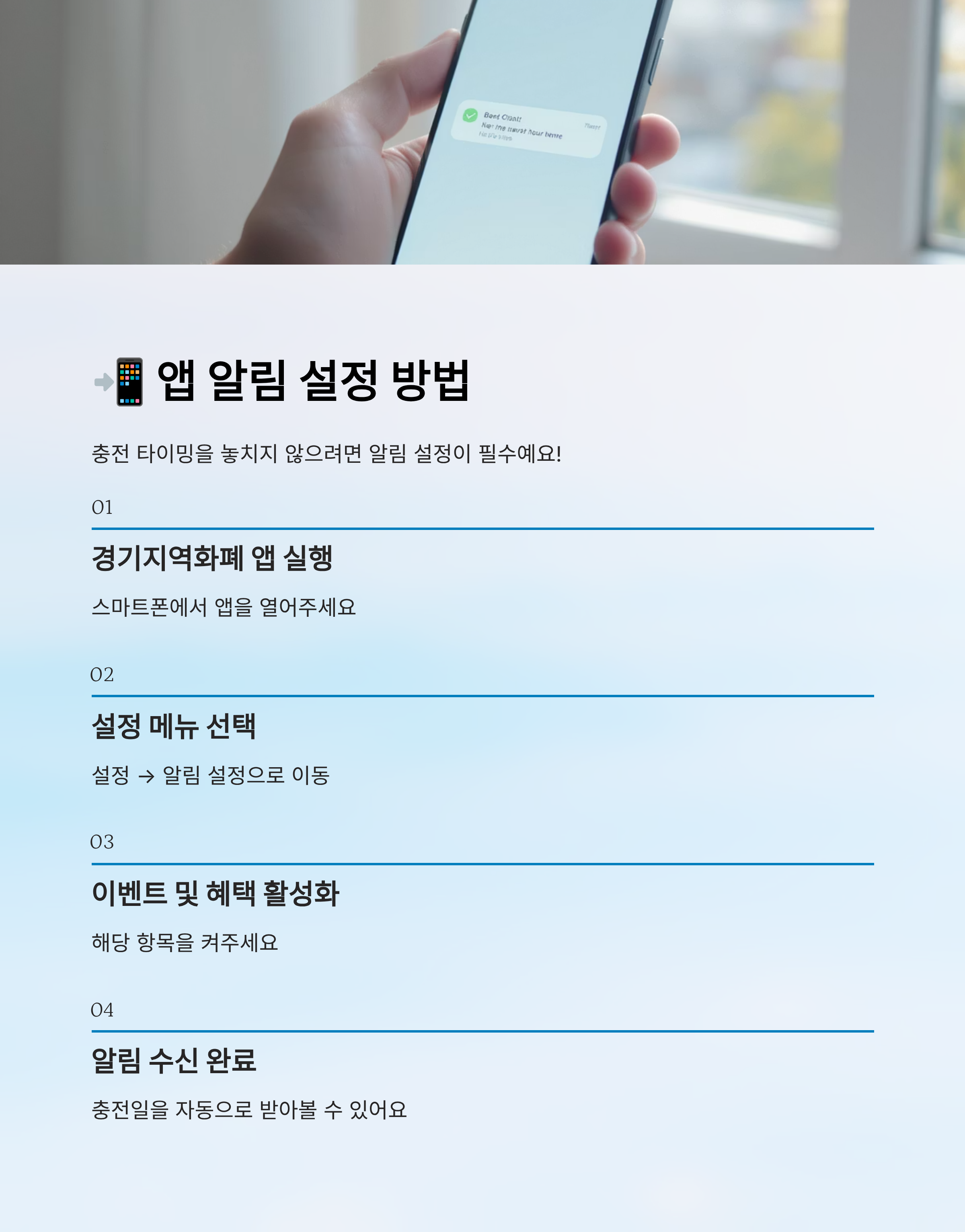 경기지역화폐 앱에는 충전 시기 알림을 받을 수 있는 기능이 있어요. '이벤트 및 혜택 알림' 옵션을 설정해두면 매달 알림을 자동으로 받아볼 수 있답니다.