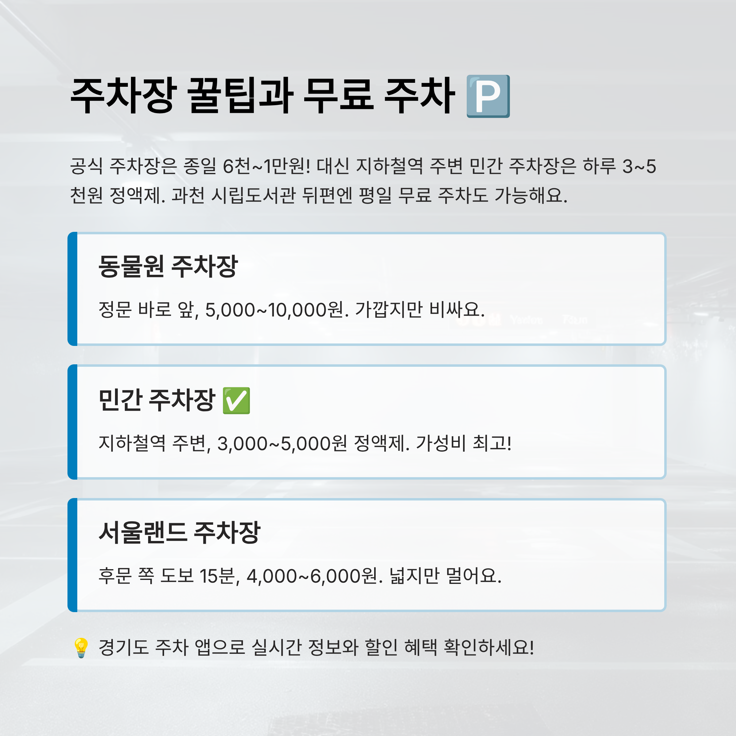 또한 ‘경기도 주차 앱’을 사용하면 주변 민간주차장 실시간 정보 + 할인 혜택까지 제공돼서 효율적이에요. 서울대공원 방문 전 한 번 체크해보면 좋아요 🚗