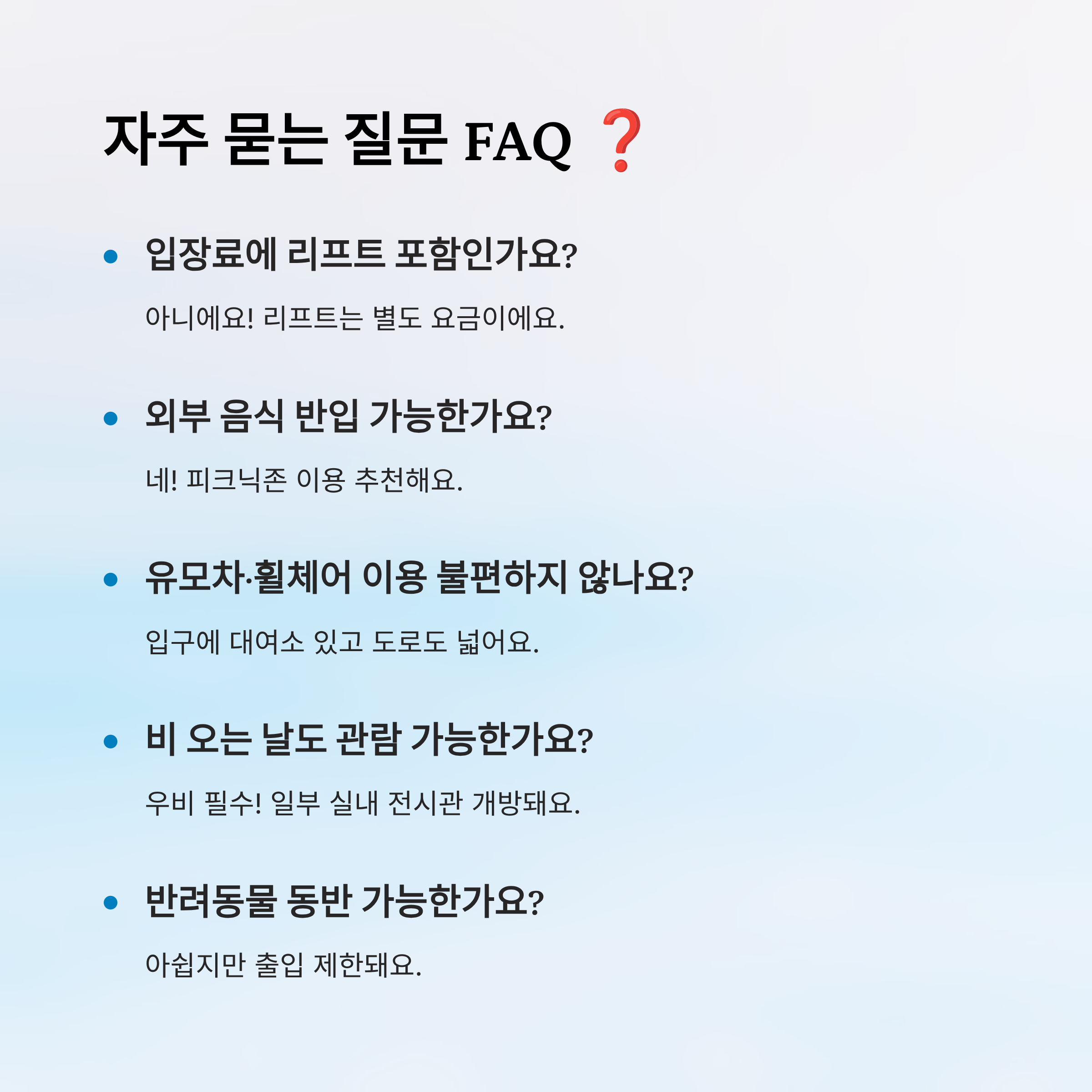 A7. 아쉽지만 동물원 특성상 반려동물 출입은 제한돼요.