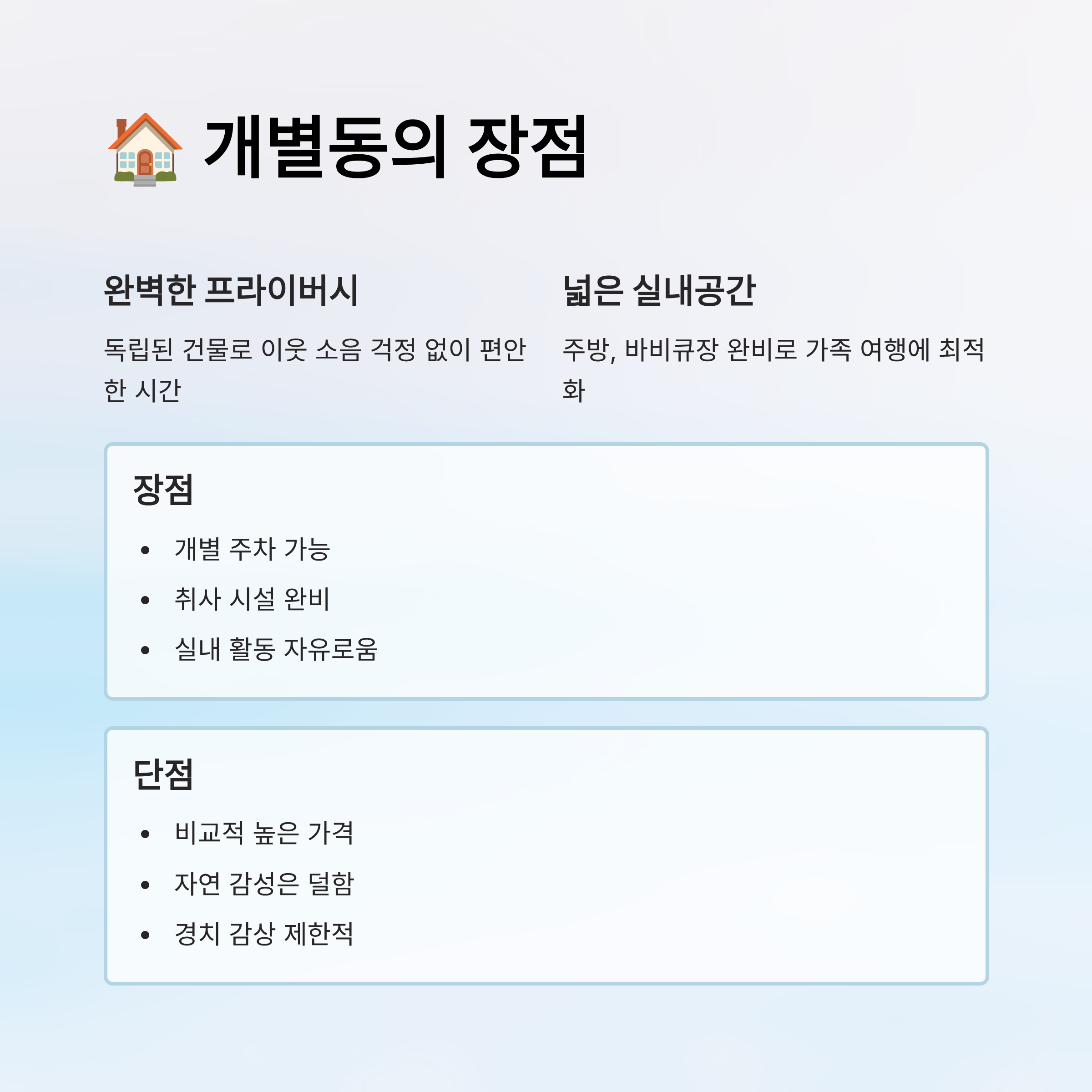 | 장점 | 프라이버시 확보, 넓은 공간, 주방 |