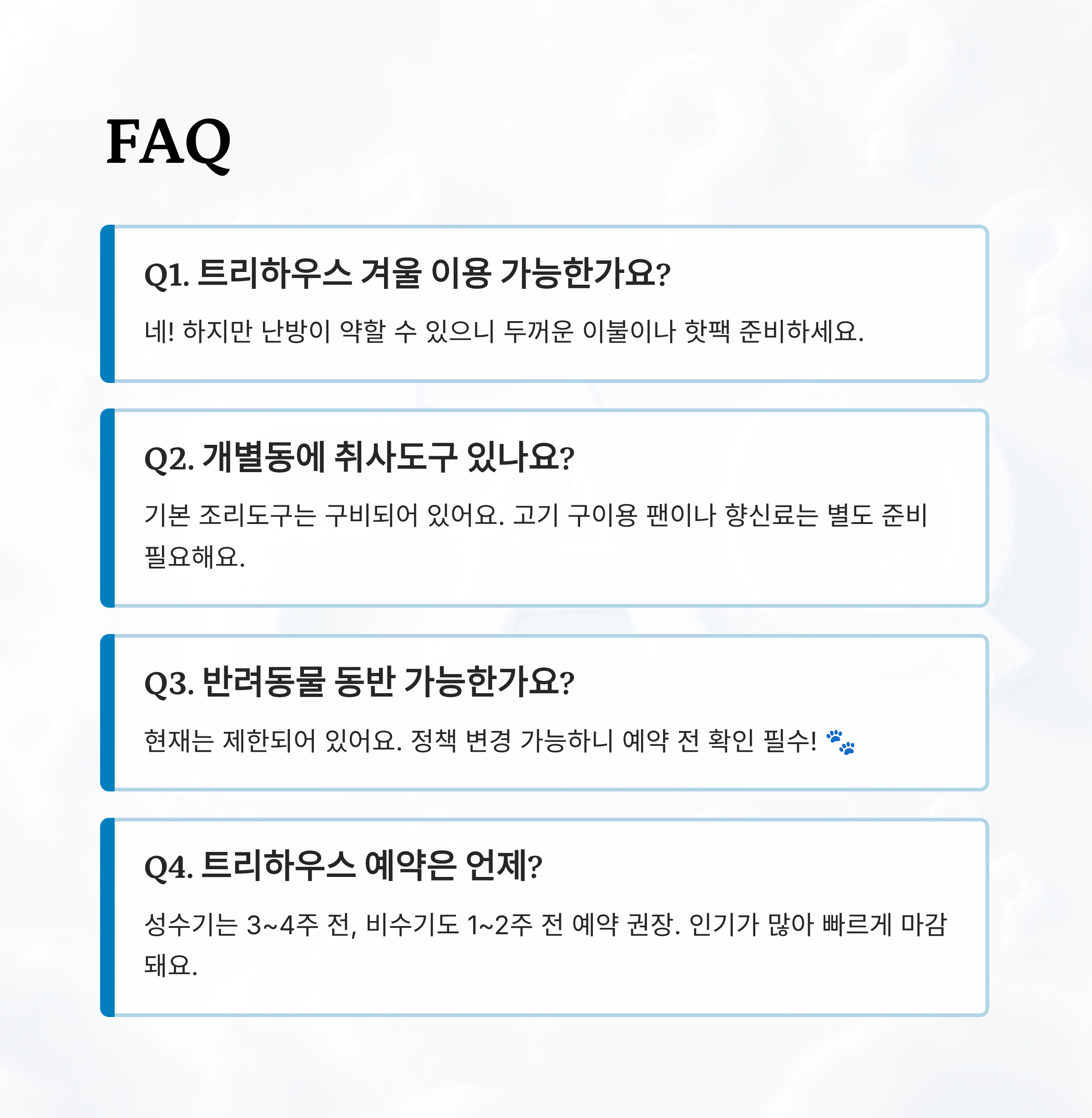 A4. 성수기(봄, 가을)에는 최소 3~4주 전, 비수기에도 최소 1~2주 전에 예약하는 것이 좋아요. 트리하우스는 수량이 적고 인기가 많아서 빠르게 마감돼요.