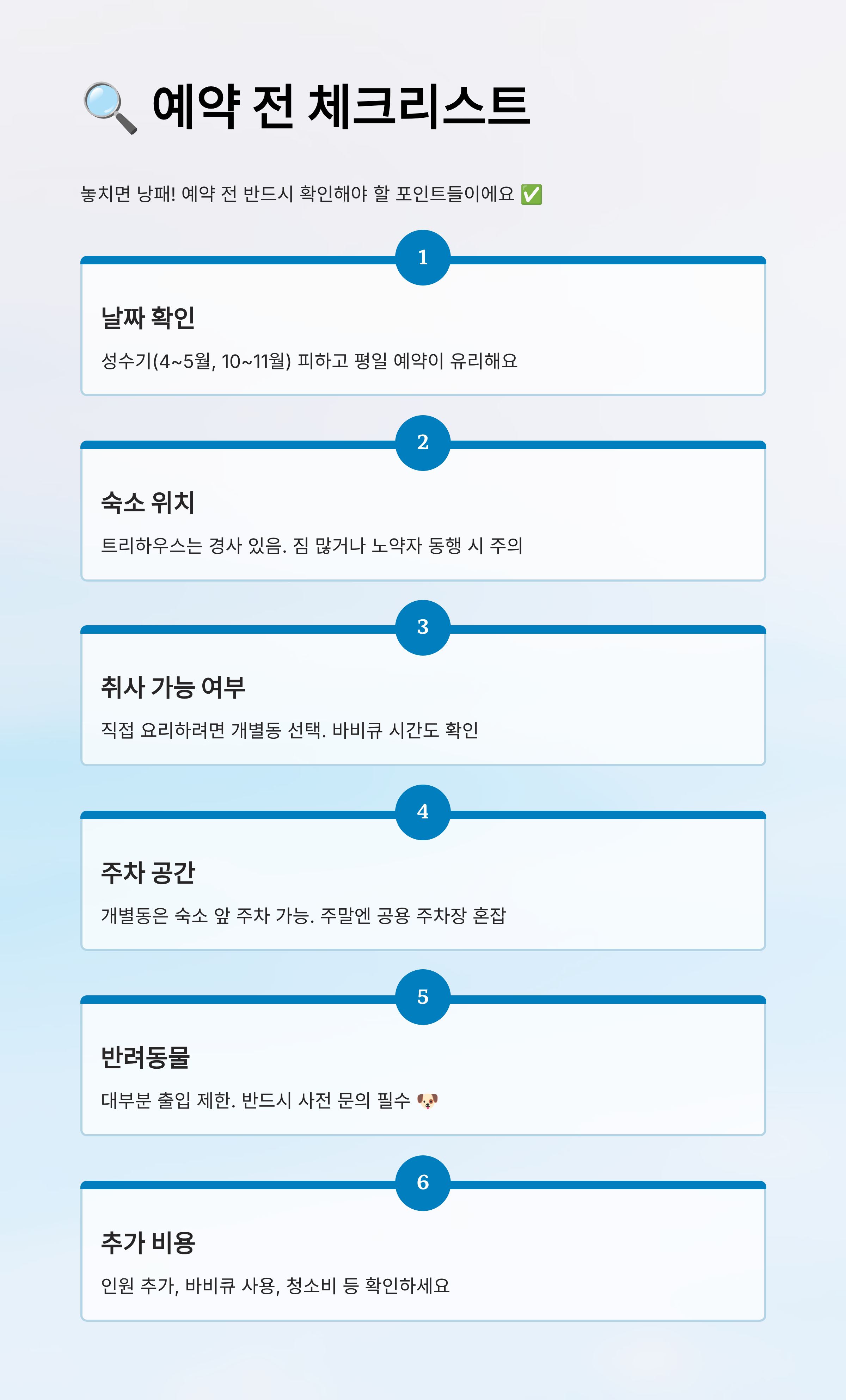6️⃣ **추가 비용 여부** 인원 추가, 바비큐 사용, 청소비 등 예약 사이트에 안내되지 않은 추가 비용이 발생할 수 있어요. ‘결제 금액’만 보지 말고, ‘이용 안내’도 꼼꼼하게 확인하세요. 특히 인원 수가 변동될 경우 꼭 사전 문의를 해야 해요!