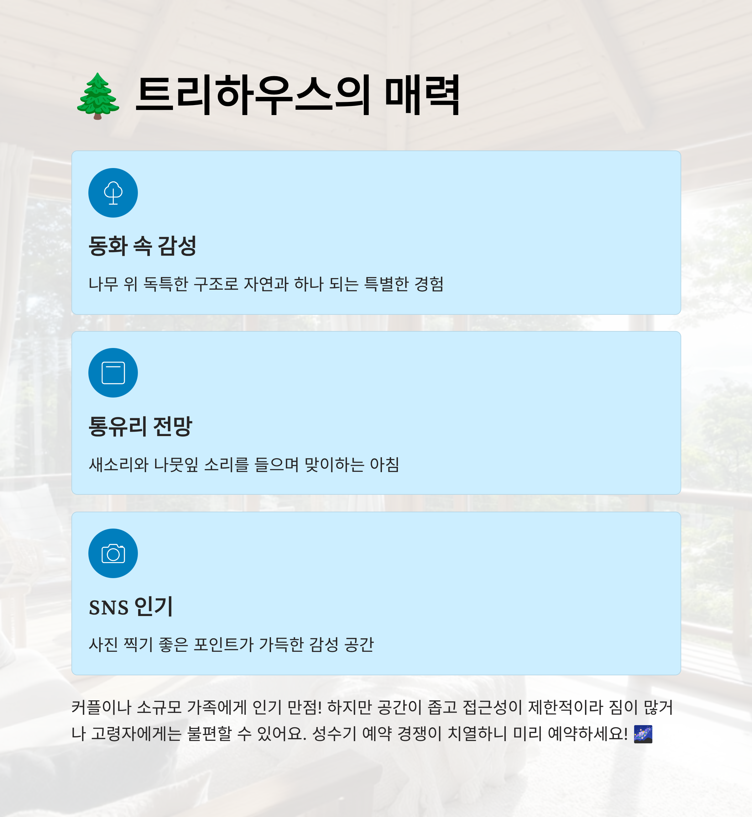 2️⃣ **숙소 위치 확인** 트리하우스는 경사가 있는 곳에 위치해 있어서 짐이 많거나 노약자 동행 시 불편할 수 있어요. 반면 개별동은 차량 진입이 수월하고, 연립동은 관리동과 가까워서 편의성은 최고예요. 숙소 구조를 미리 확인해두는 게 좋아요.