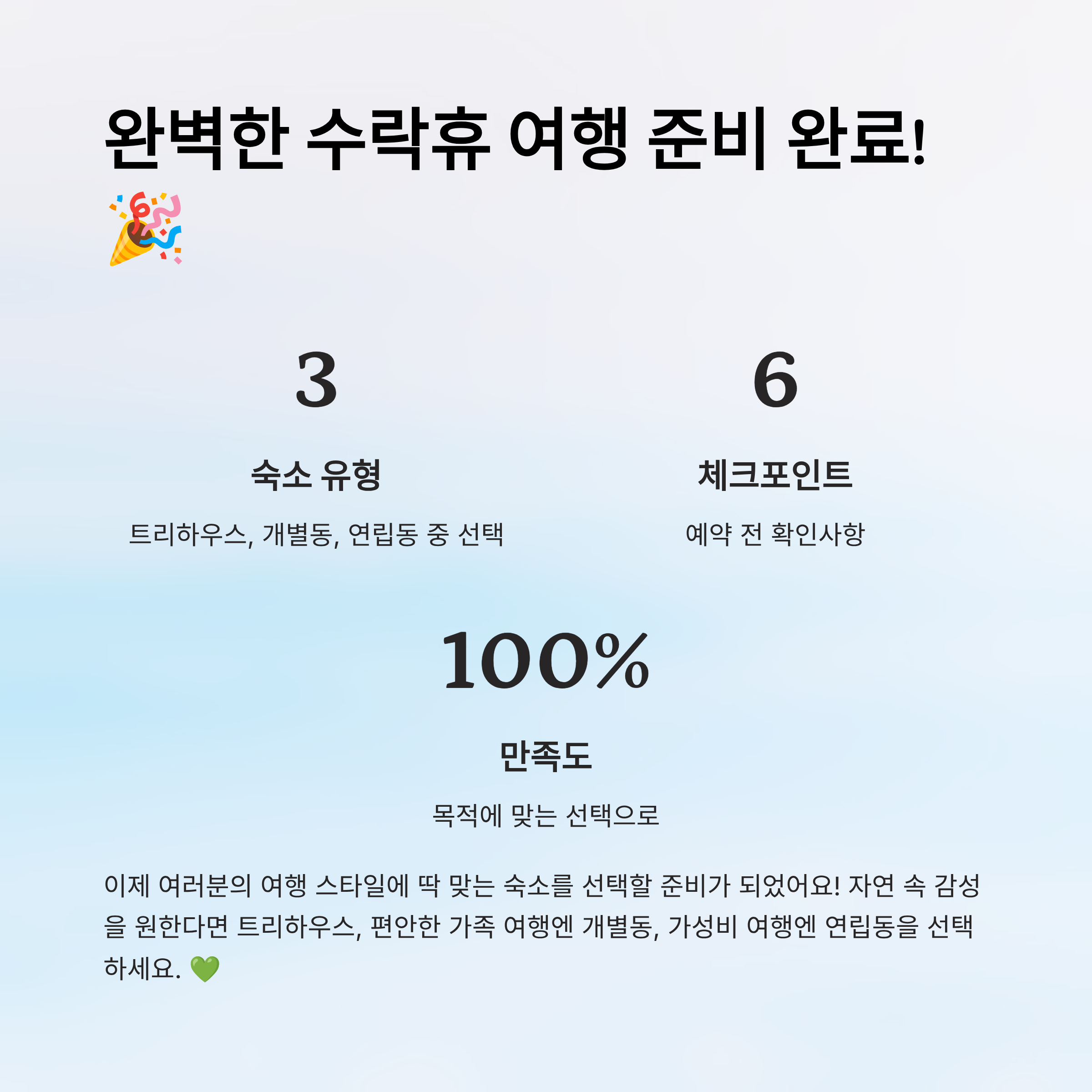 어떤 숙소가 나에게 가장 잘 맞을까? 여행 목적, 인원수, 분위기, 프라이버시까지 고려해야 하니 고르기 쉽지 않죠. 그래서 오늘은! 수락휴에서 제공하는 세 가지 숙소 유형의 장단점을 확실하게 정리해봤어요. 한눈에 비교하고, 나에게 맞는 선택을 도와줄게요! 🎒