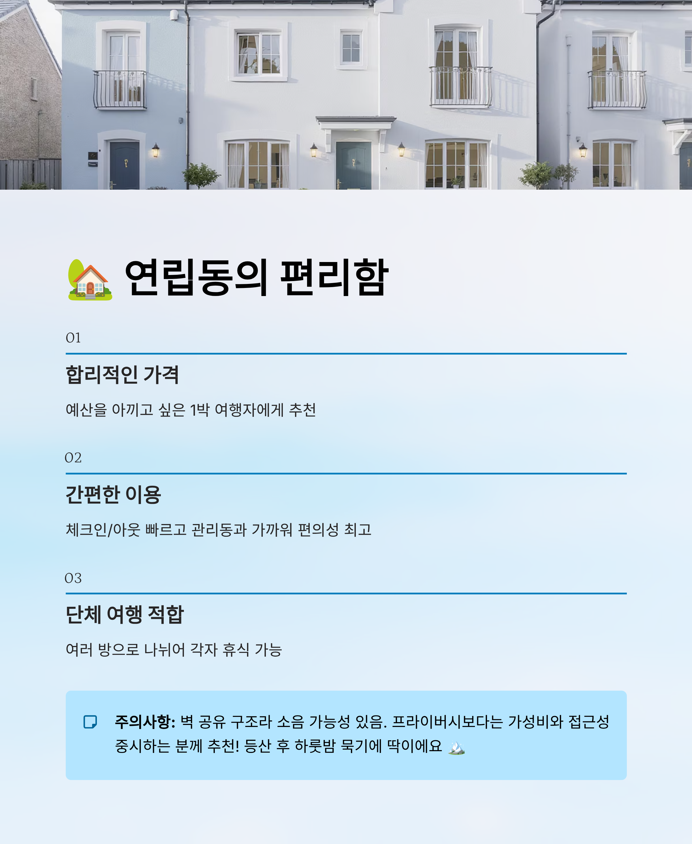 다만, 벽을 공유하는 구조라서 소음이 있을 수 있어요. 예민한 분들이라면 이 점이 단점이 될 수 있어요. 또, 자연 뷰를 즐기기엔 한계가 있기에 경치를 중요시하는 분들에게는 아쉬울 수도 있어요. 🪟