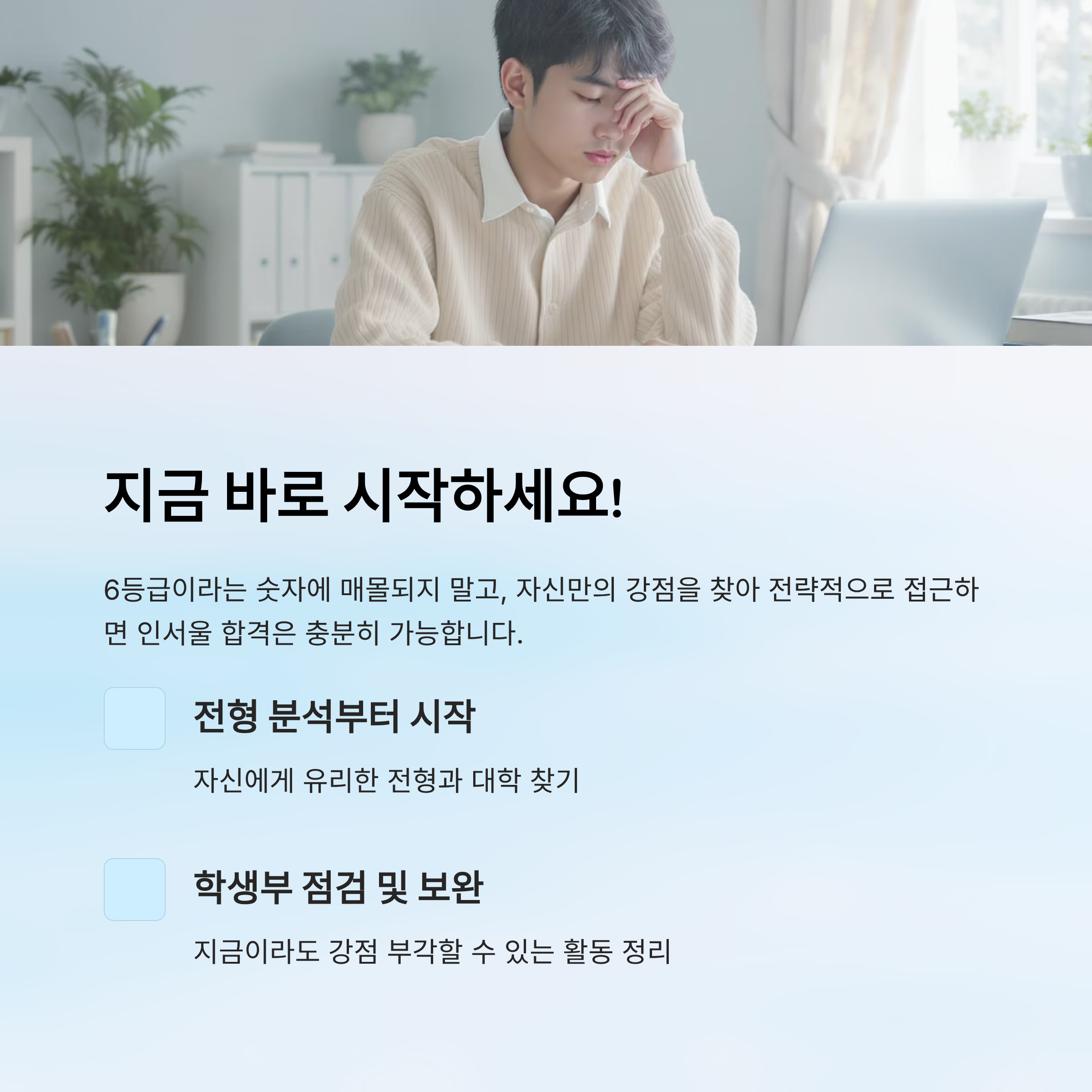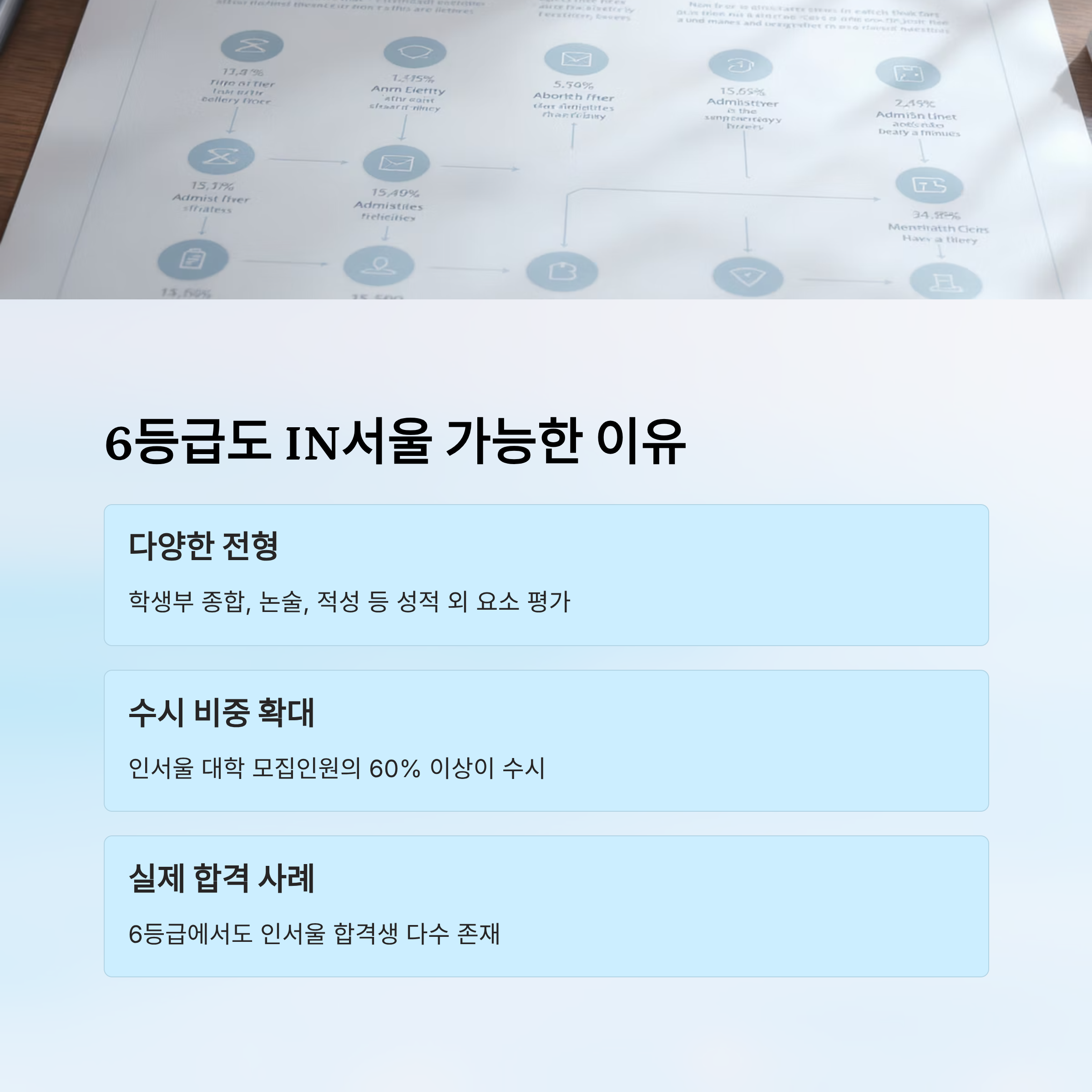 이 요약표에서 보듯, 합격의 길은 다양하고 성적이 전부가 아니에요. 지금 6등급이라도, 자신에게 맞는 전략을 세운다면 분명히 문은 열려 있어요.