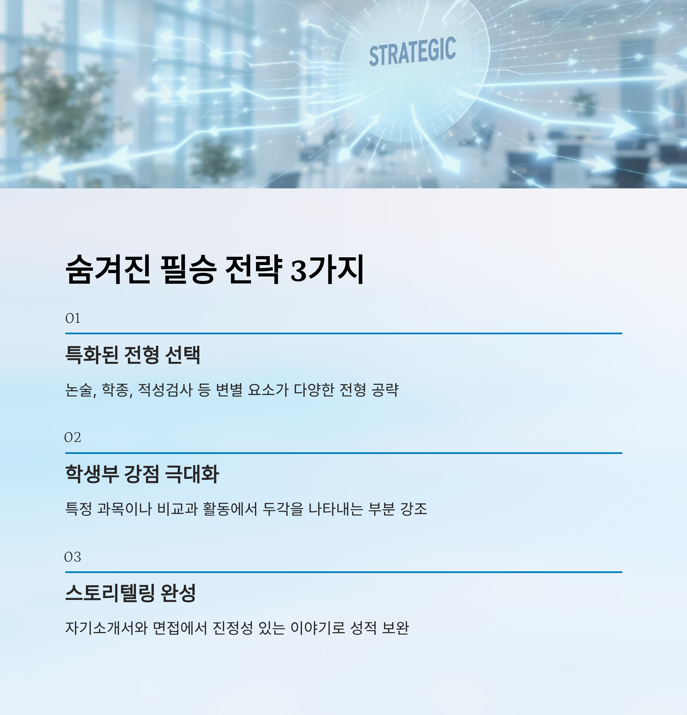 한 발 더 나아가, 입시 컨설턴트들이 공통적으로 강조하는 건 "맞춤형 지원 전략"이에요. 모든 대학에 일률적으로 지원하는 것이 아니라, 자신의 기록과 장점을 반영해 유리한 대학과 전형을 선별하는 것이 핵심이에요. 이 부분은 뒤에서 다룰 '숨겨진 필승 전략 3가지'에서 더 자세히 알려드릴게요.