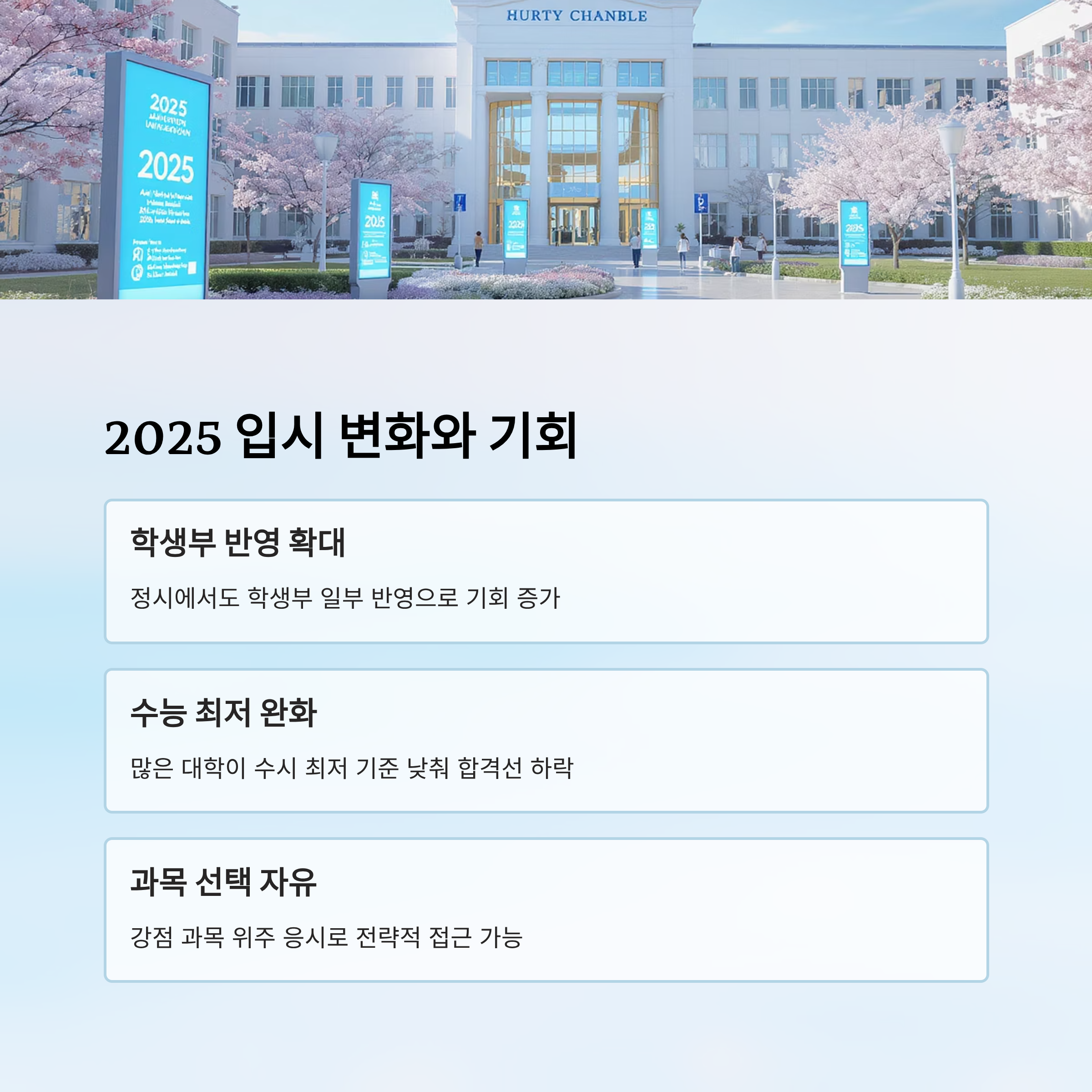 | 학생부 반영 확대 | 정시에도 학생부 일부 반영 | 비교과 활동 강조 |