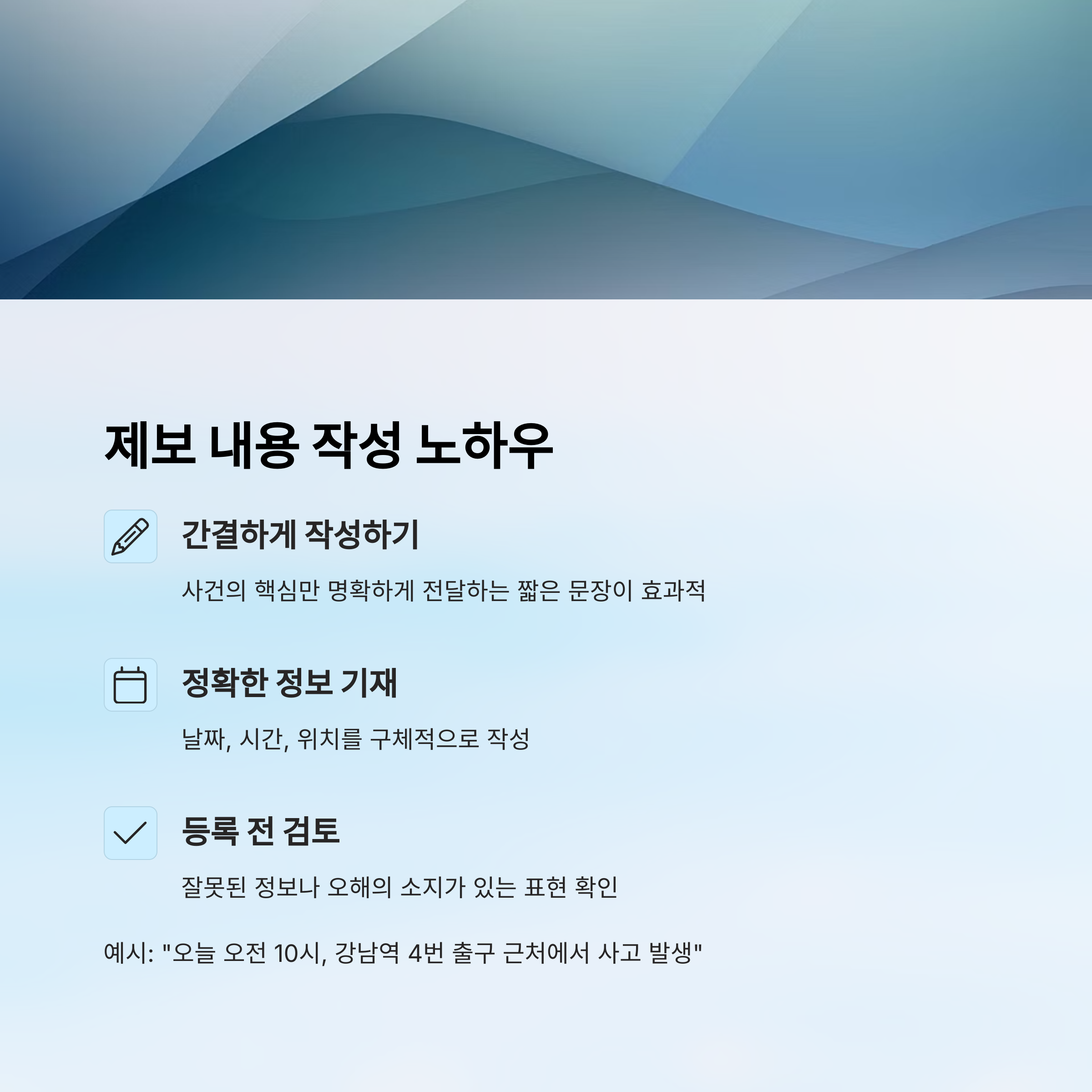 제보할 때는 사건의 핵심만 간결하게 작성하는 것이 좋아요. 긴 글보다 중요한 사실을 빠르게 전달할 수 있는 짧고 명확한 문장이 효과적이에요. 예를 들어 "OO역 근처, 화재 발생 중. 소방차 출동!" 같은 식으로 말이죠.