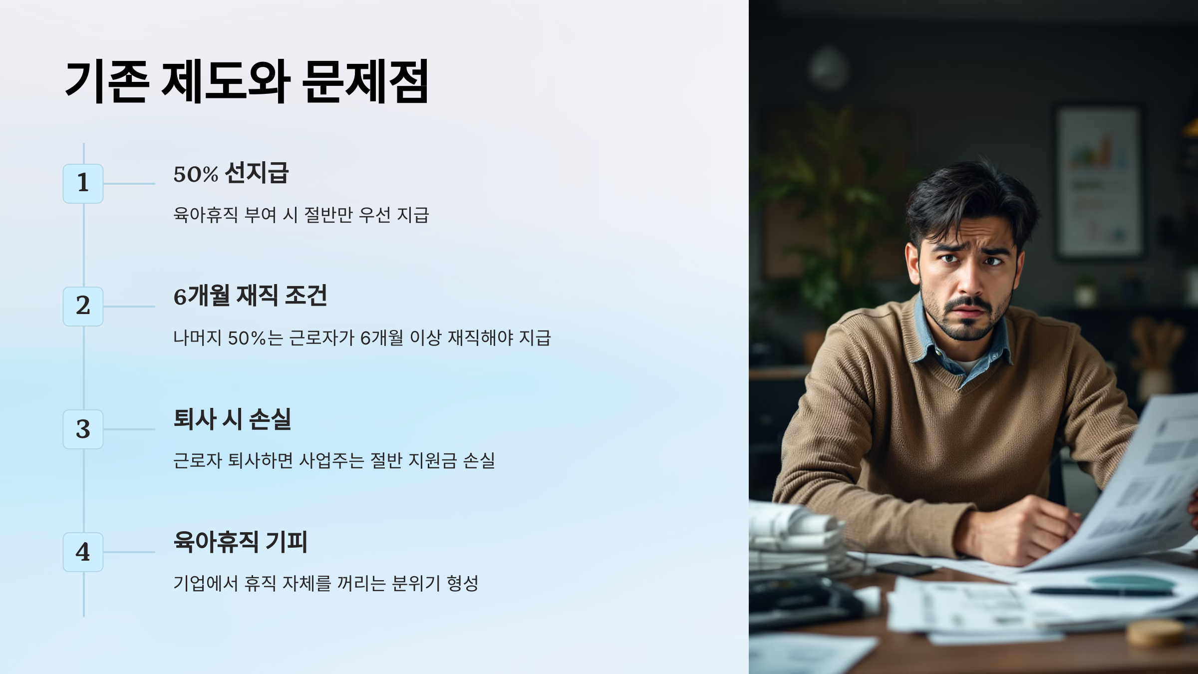하지만 여기엔 함정이 있었어요. 근로자가 개인 사정으로 퇴사하거나 육아 때문에 직장을 완전히 떠나는 경우, 사업주는 절반밖에 지원받지 못하는 일이 생긴 거예요.
