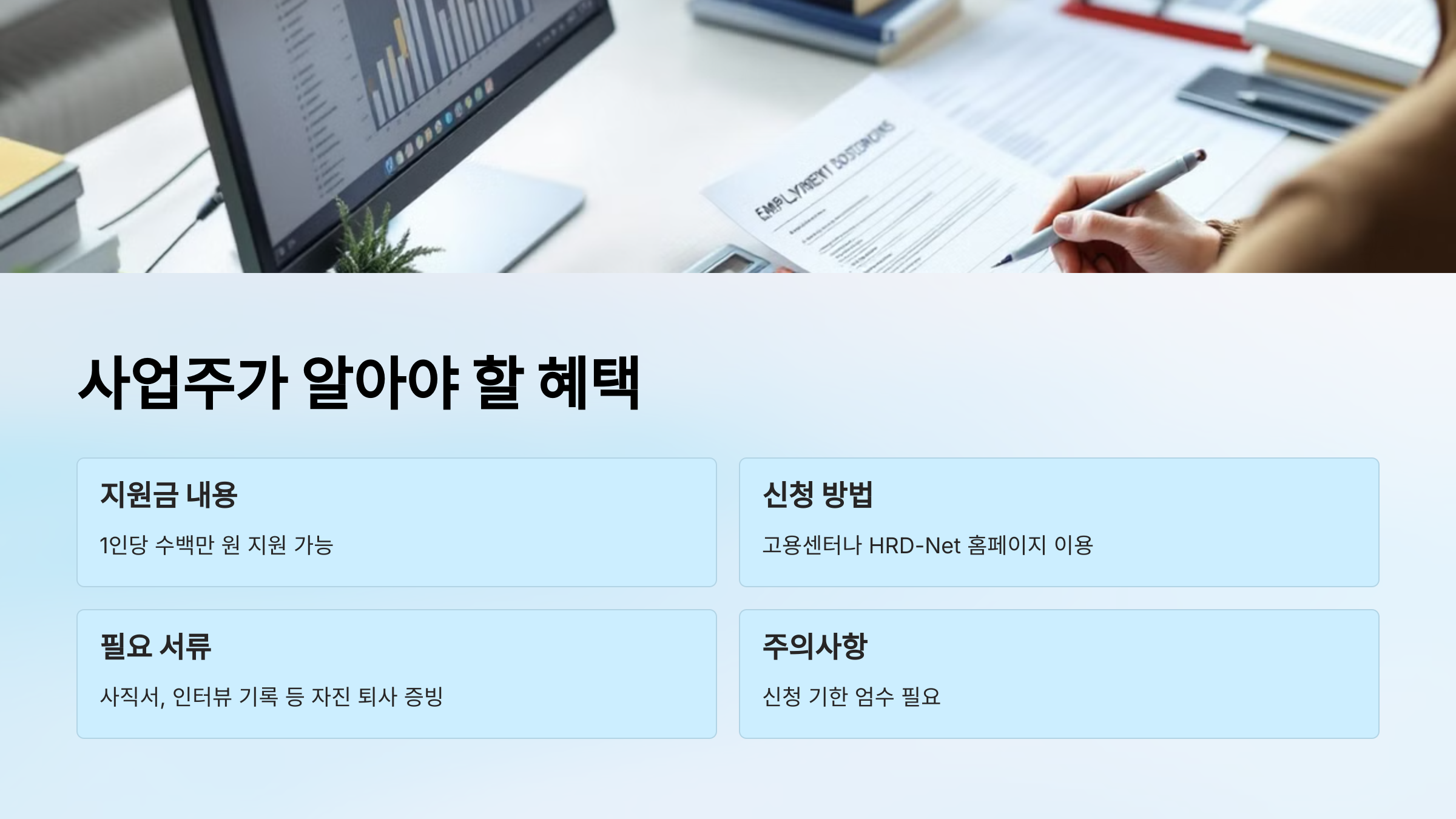 지원금 신청은 고용센터 또는 HRD-Net(고용노동부 고용지원 포털)에서 진행해요. 온라인 신청도 가능하고, 서류 제출도 전산화되고 있어요.