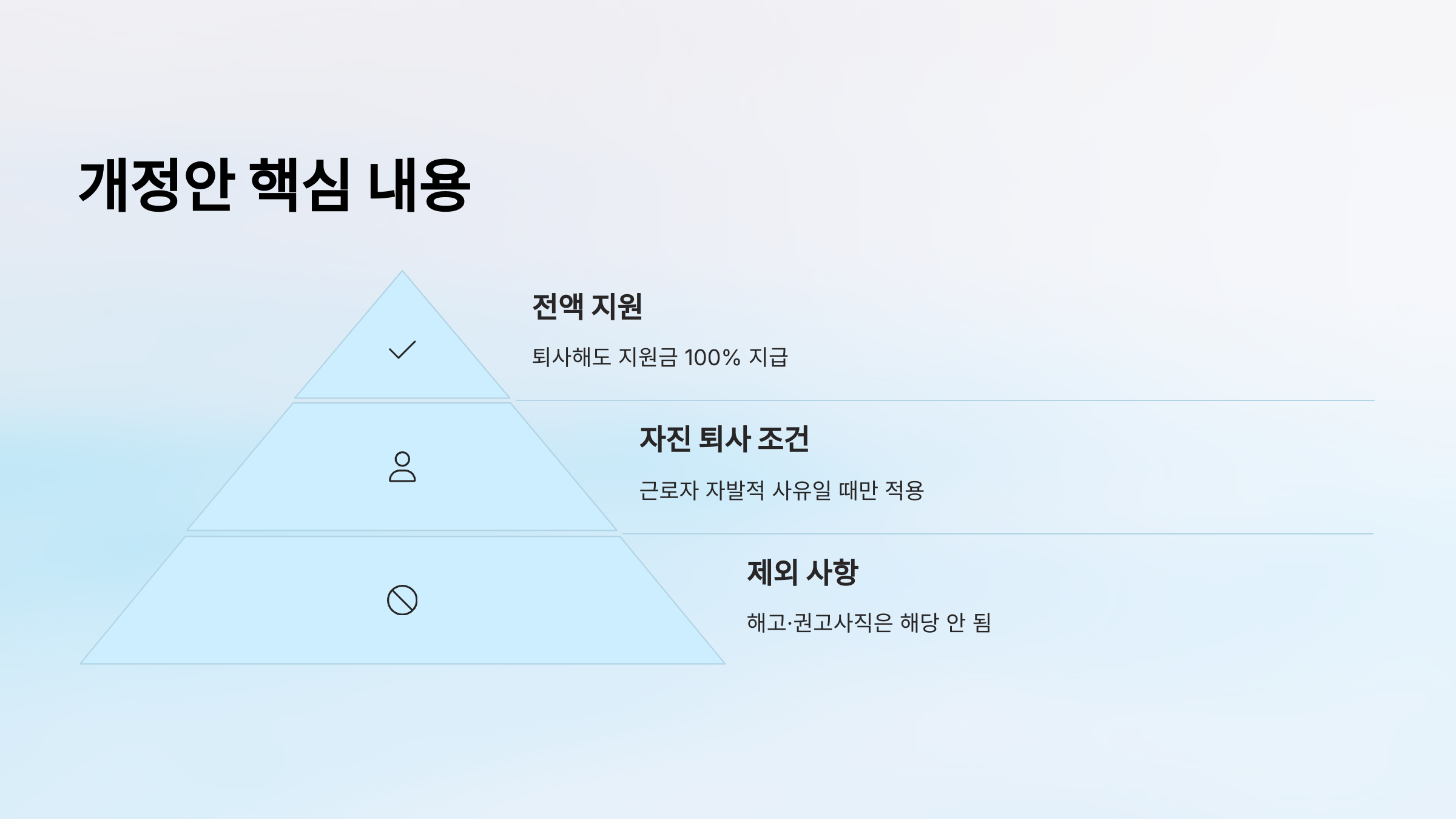 과거에는 6개월 이상 재직해야만 나머지 50%가 지급됐지만, 이제는 '자진 퇴사'라면 그 조건 없이도 전액이 지급돼요. 👏