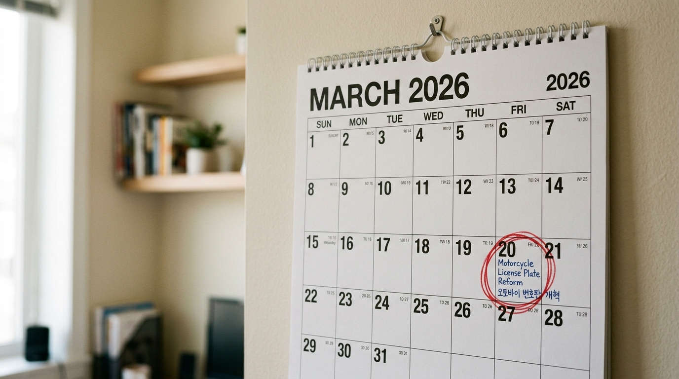 - 이륜차 전국 번호판 도입: 2026년 3월 20일부터 오토바이도 지역명 없는 전국 번호판 시대가 열립니다. 신규 등록 시 필수입니다.