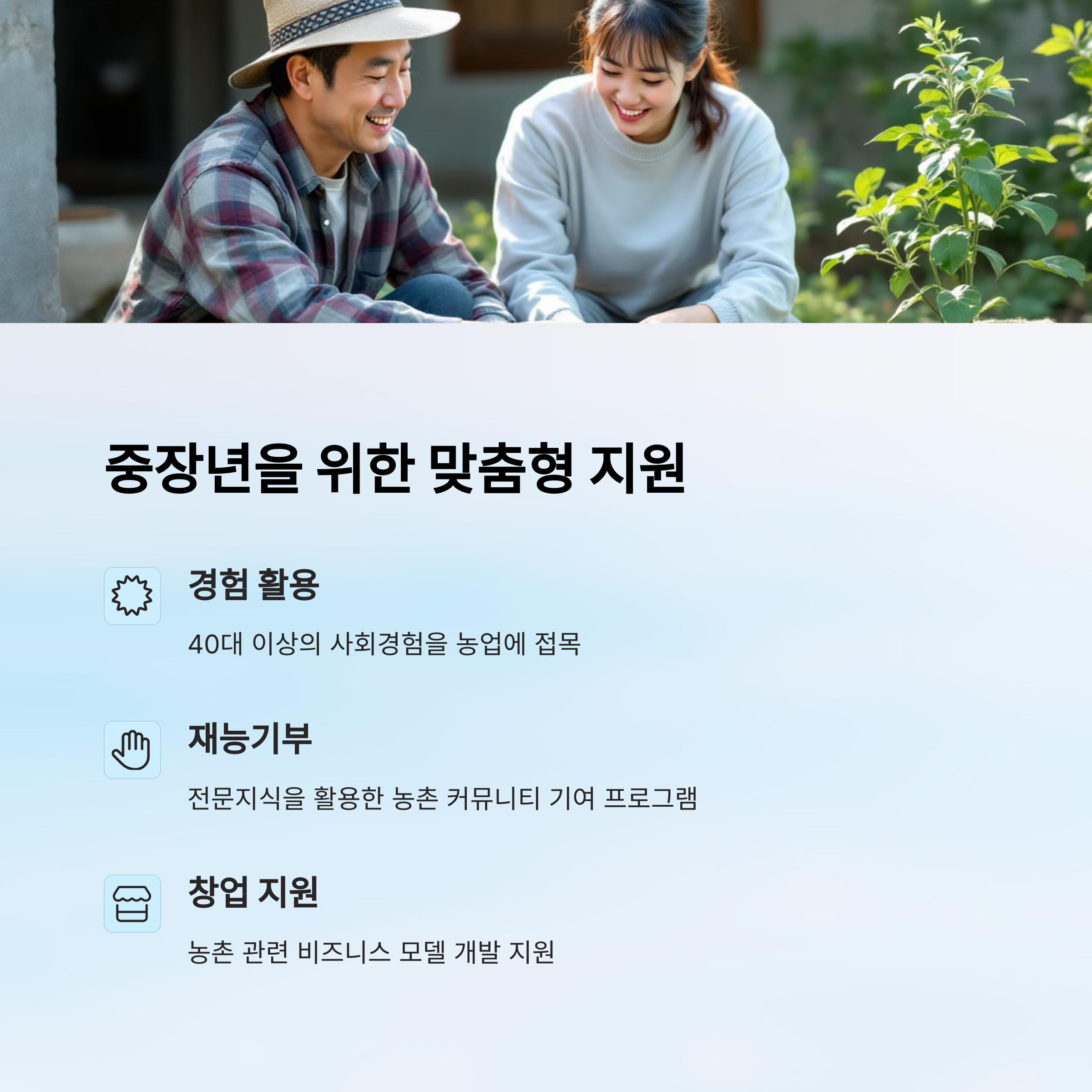 결국 중장년 귀농은 ‘삶의 전환’이 중심이에요. 정착에 시간이 걸릴 수 있지만, 오히려 경험과 자금이 안정적이라면 더 깊이 있는 귀농이 가능해요. 특히 가족과 함께 하는 경우, 지역사회에 융화될 수 있도록 마을 환영 프로그램도 있으니 참고해보세요!