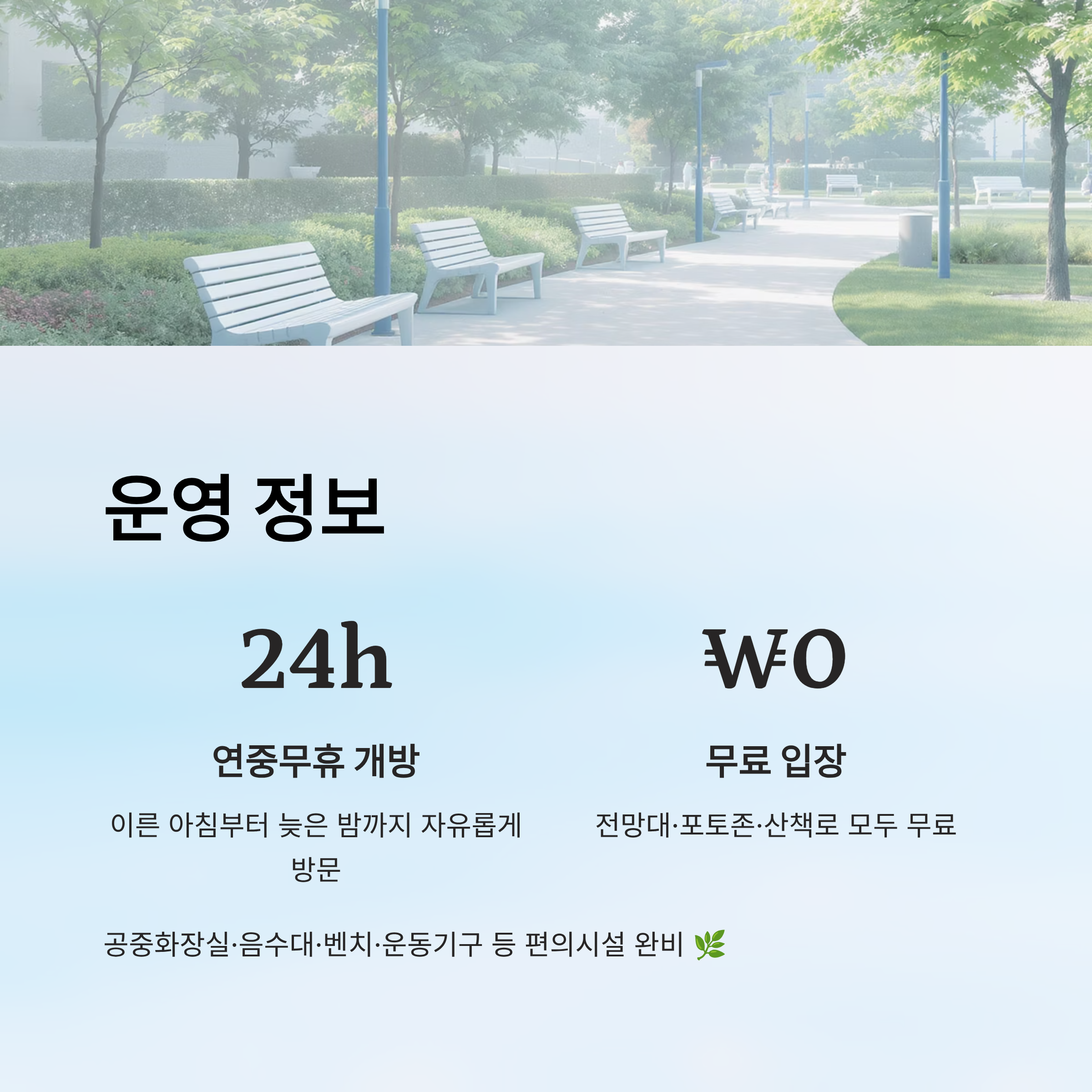 공원에는 공중화장실, 음수대, 벤치, 운동기구 등 편의 시설도 잘 마련되어 있어요. 가족 나들이나 도시 속 휴식 장소로 딱이랍니다. 그리고 무엇보다도 평화롭고 조용한 분위기가 방문객들에게 큰 만족을 주고 있어요. 🌿🏞️