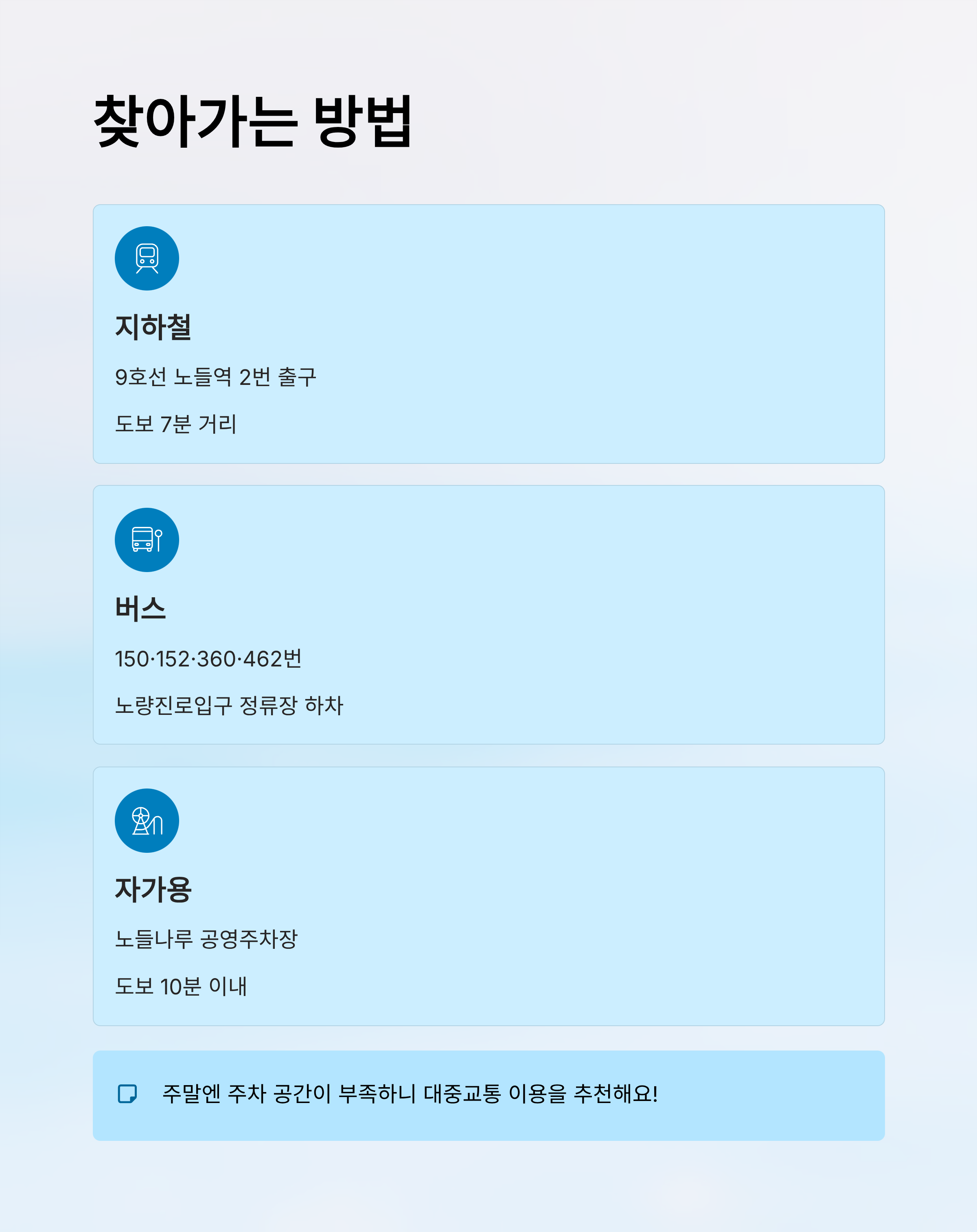 자가용을 이용할 경우에는 주변 주차 공간이 부족하므로 노들나루 공영주차장을 추천해요. 이곳은 공원에서 도보 10분 이내 거리이며, 주말에는 혼잡할 수 있으니 일찍 도착하는 것이 좋아요. 근처 도로는 일방통행 구간도 있으니 네비게이션 경로를 꼼꼼히 확인해야 해요.