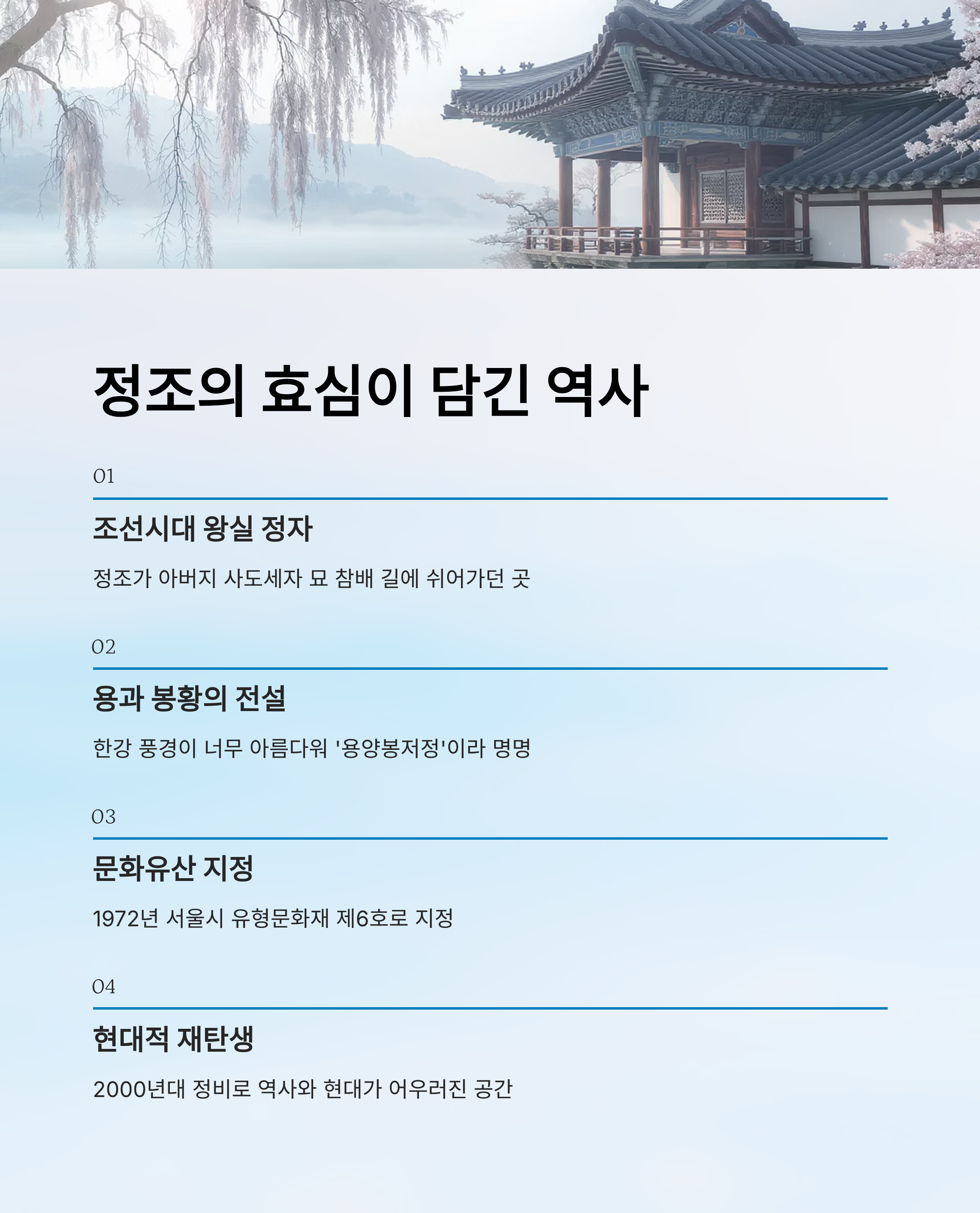 용양봉저정은 단순한 공원이 아니라 조선시대 왕실의 흔적이 남아 있는 문화유산이에요. 이곳은 조선 제22대 임금 정조가 아버지 사도세자의 묘를 참배하러 수원 화성으로 가는 길목에서 잠시 쉬어가던 곳이에요. 정조는 한강을 따라 행차할 때, 노량진 인근에서 배다리를 이용했는데, 이 정자에서 바라본 풍경이 너무 아름다워 용이 날아오르고 봉황이 솟는 듯하다고 감탄하며 '용양봉저정(龍躍鳳擲亭)'이라 이름 붙였다고 해요.