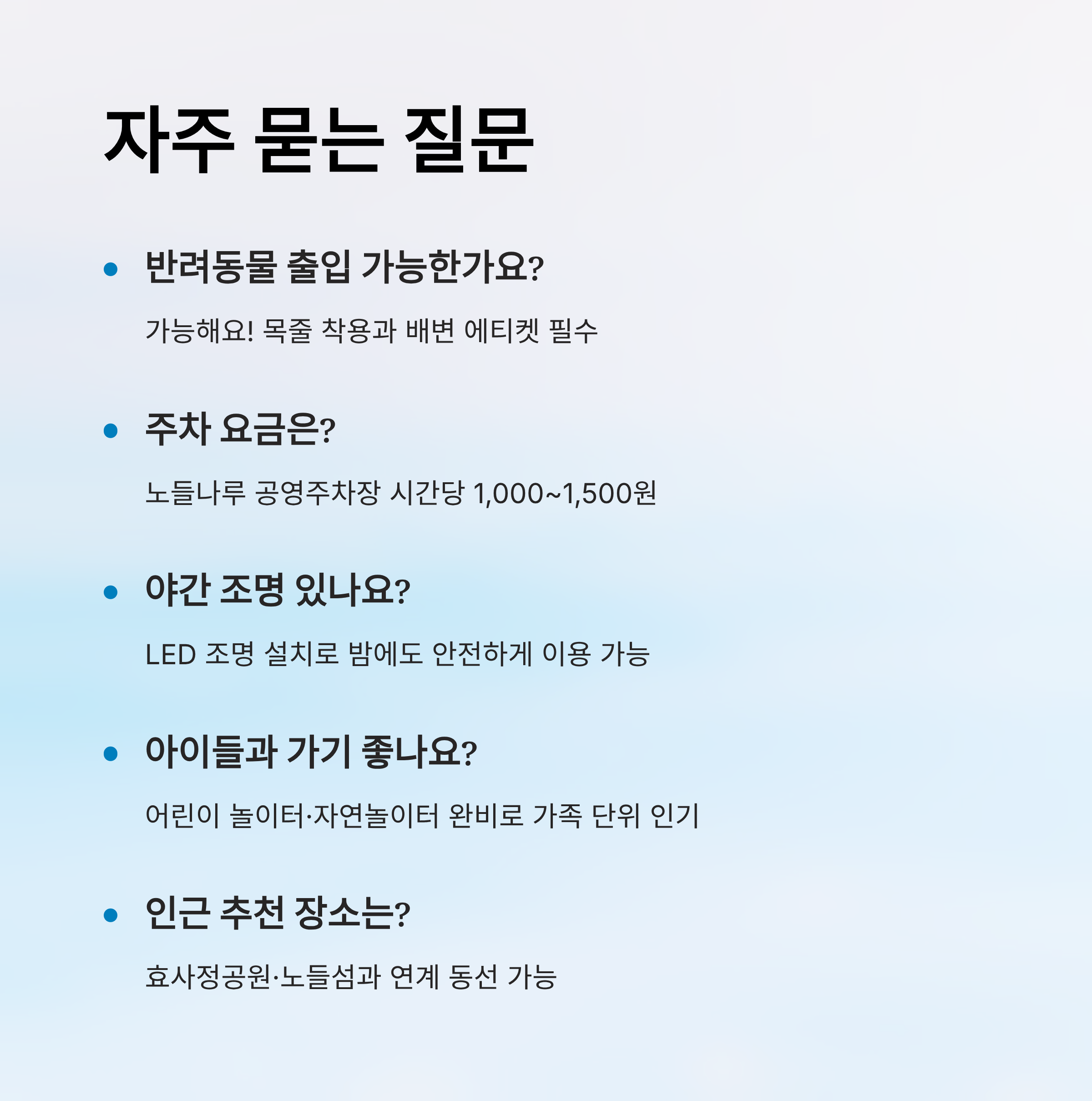 A1. 가능해요! 단, 반려동물은 반드시 목줄을 착용해야 하고, 배변 봉투 등 기본적인 에티켓은 꼭 지켜야 해요.