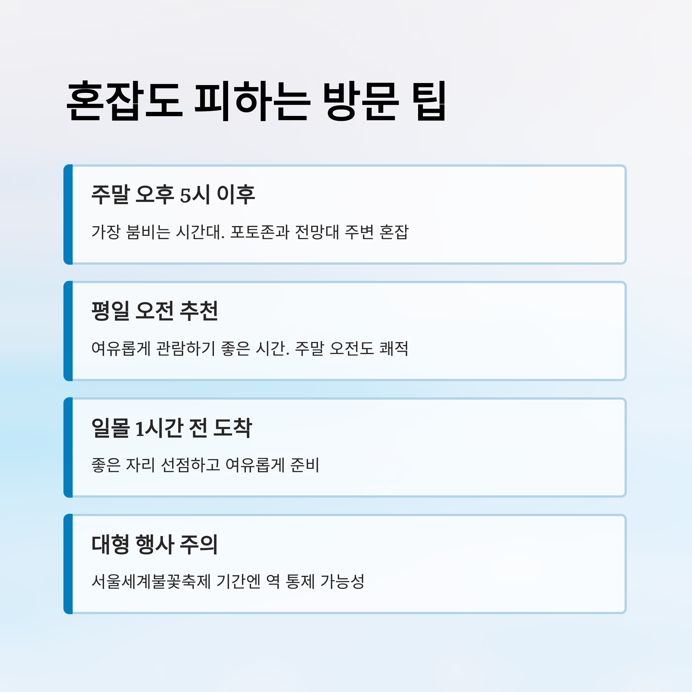 혼잡을 피하려면 평일 오전이나 주말 오전 시간대가 좋아요. 일몰 직후의 야경을 감상하고 싶다면, 적어도 해지기 1시간 전에는 도착해 여유롭게 자리 잡는 것을 추천해요. 또한 혼잡한 날은 노들섬 방향이 아닌 반대쪽 진입로를 활용하면 비교적 쾌적하게 관람할 수 있답니다. 🕶️🌇