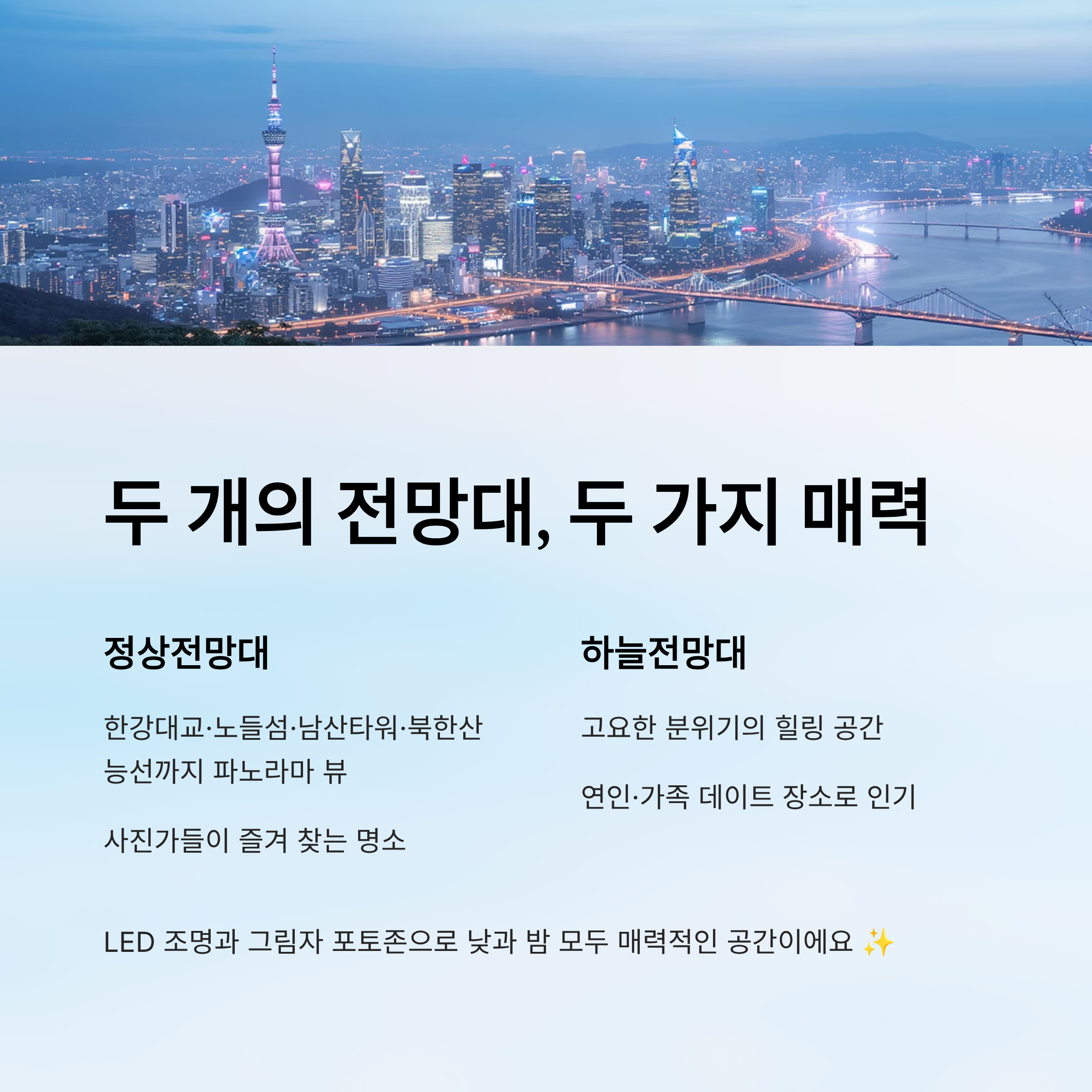 정상전망대에서는 한강대교, 노들섬, 남산타워, 북한산 능선까지 보이는 넓은 파노라마 뷰를 감상할 수 있어요. 도시 중심부를 한눈에 조망할 수 있다는 점에서 사진가들이 자주 찾는 스팟이기도 해요. 심지어 운이 좋다면 야경에 날씨까지 받쳐줘서, 서울의 명장면을 눈에 담을 수 있답니다. 🌃📸