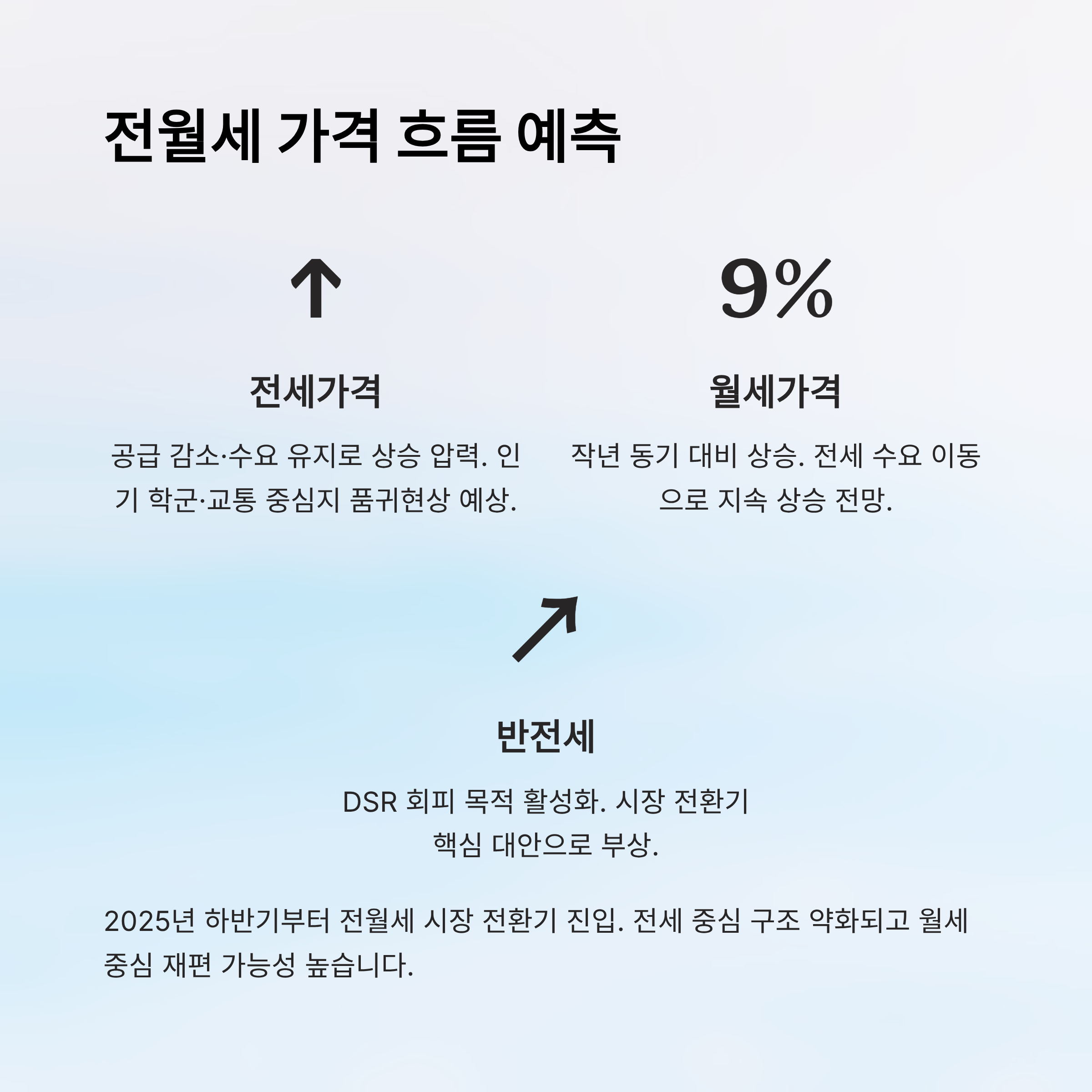 결론적으로, 2025년 하반기부터 2026년 상반기까지는 전월세 시장이 ‘가격 정체기’를 넘어서서 ‘전환기’로 들어가는 시점이에요. 기존과 같은 전세 중심 구조는 약화되고, 수요와 공급 모두 월세 중심으로 재편될 가능성이 커요. 그렇기 때문에 세입자와 집주인 모두 계약 형태를 다시 점검하고, 시장 흐름에 유연하게 대처하는 게 필요해요. 💹