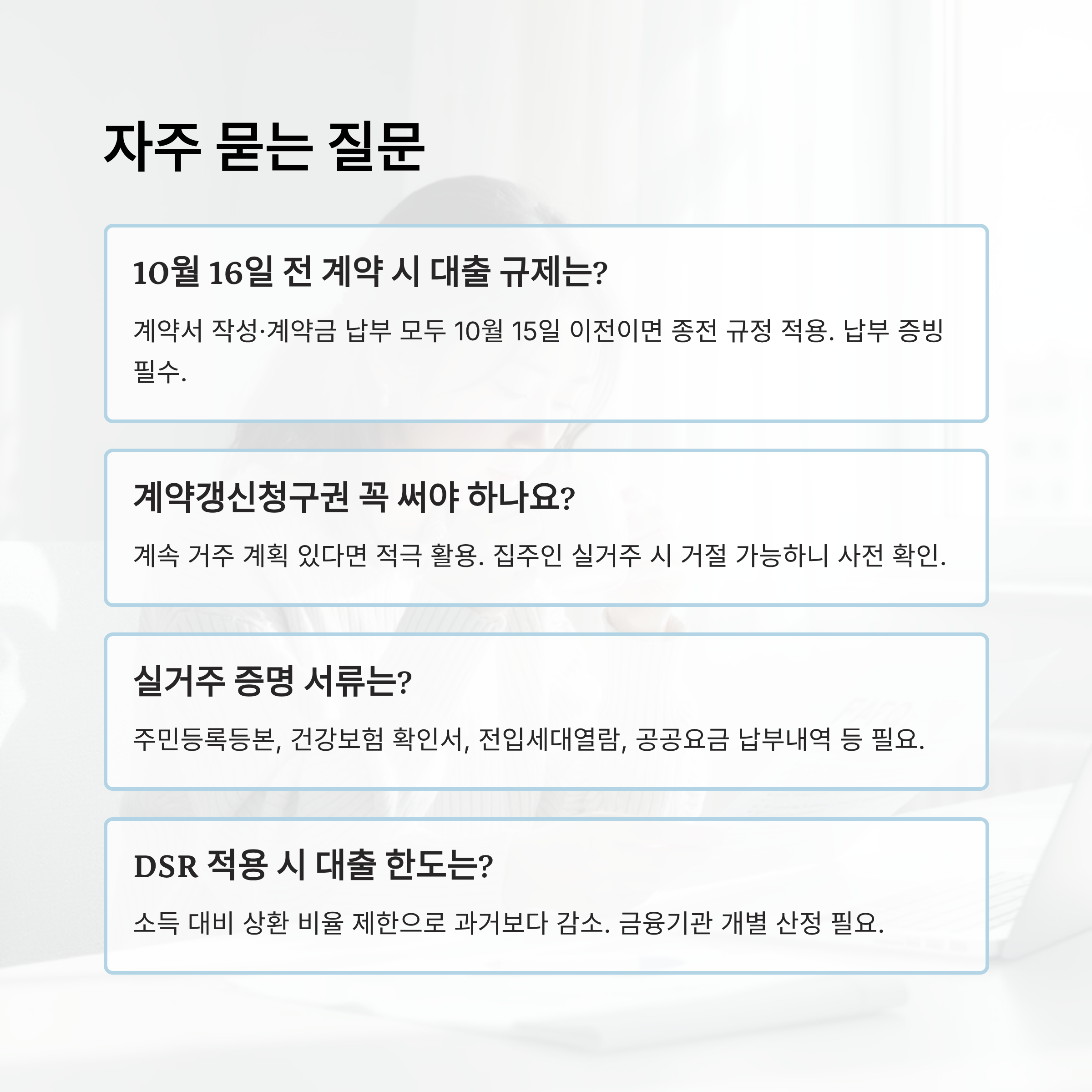 또한, 최근 강화된 규제에 따라 주거 이전 계획이 있다면 되도록 시행일 이전에 계약을 마무리하는 것이 유리해요. 예를 들어, 10월 29일 이후부터는 전세대출도 DSR에 적용되기 때문에 10월 28일까지 계약을 마무리하고 계약금 납부까지 완료해야 종전 규정의 혜택을 받을 수 있어요. 이건 작은 차이지만 실질적으로 수천만 원의 차이를 만들 수 있어요.