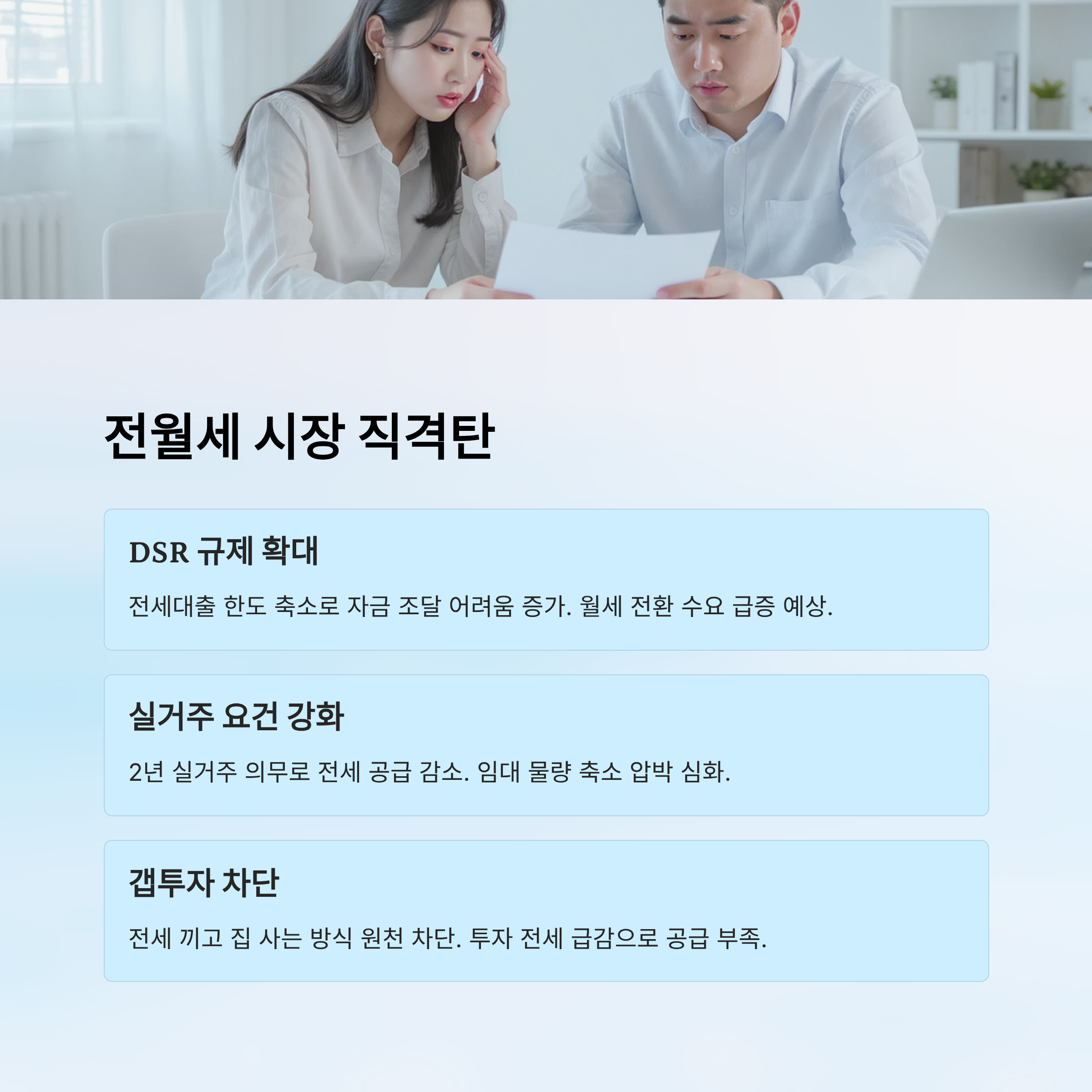 DSR 규제가 적용되면 기존보다 대출 한도가 줄어들고, 이에 따라 세입자들은 전세금 마련이 훨씬 어려워져요. 결국 월세 전환 수요가 늘어나게 되고, 이는 월세 시장의 가격 상승으로 이어질 수 있다는 거죠. 게다가 집주인 입장에서도 '갭투자'가 원천 차단되기 때문에 전세를 끼고 집을 사는 방식이 막혀버려요. 이로 인해 전세 공급이 줄어들 수 있고, 자연스럽게 전세가격은 오를 가능성이 높아요.
