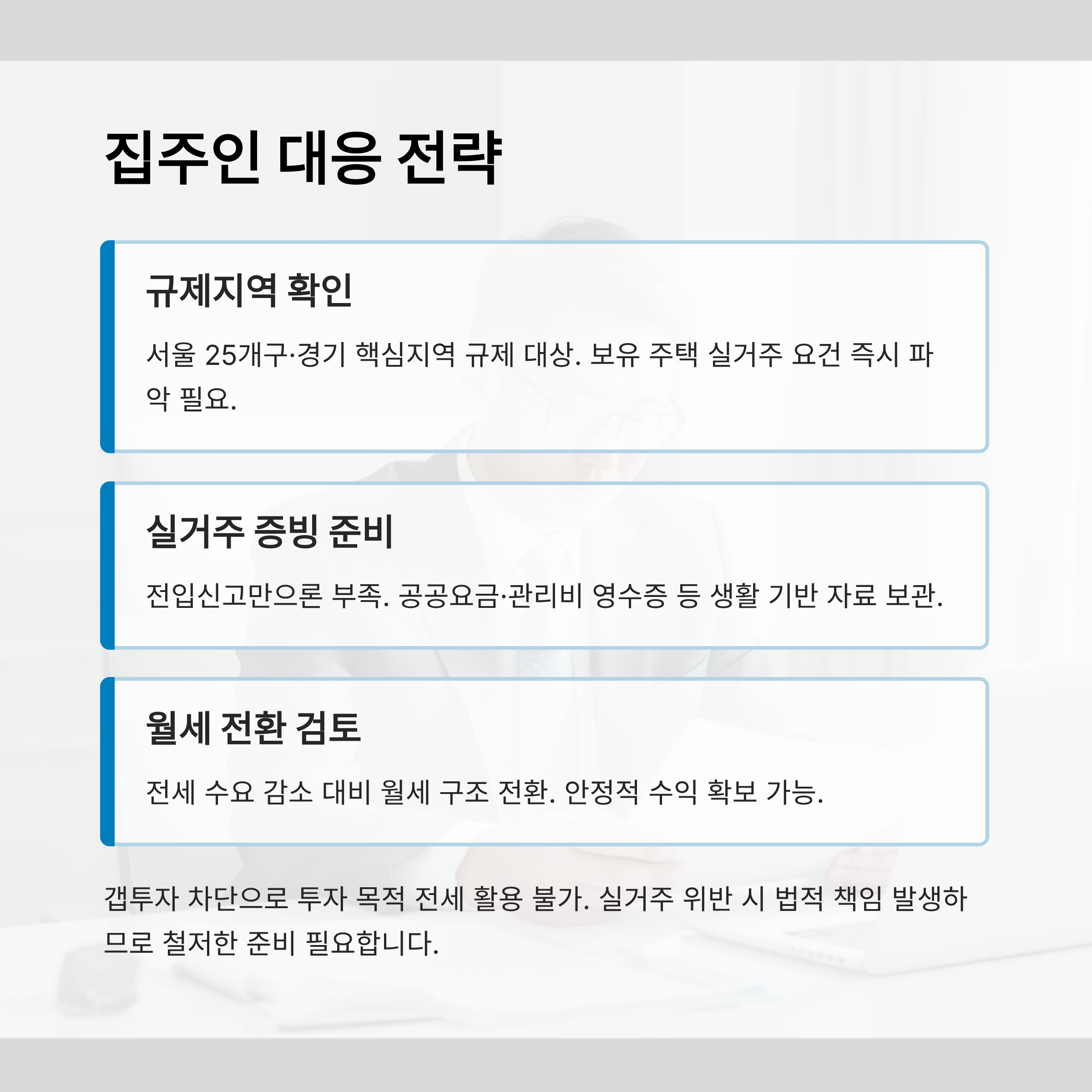 그렇다면 집주인 입장에서 어떤 전략이 필요할까요? 첫 번째는 보유 주택이 규제지역인지, 실거주 요건 대상인지부터 정확히 파악하는 거예요. 특히 서울 25개구 전역과 경기도의 주요 핵심지역이 규제지역으로 묶였기 때문에, 해당 지역의 부동산을 소유하고 있다면 바로 확인해야 해요. 그리고 혹시라도 매매를 계획 중이라면, 실거주 의무가 생기지 않도록 계약일과 계약금 납부일을 철저히 관리해야 해요.