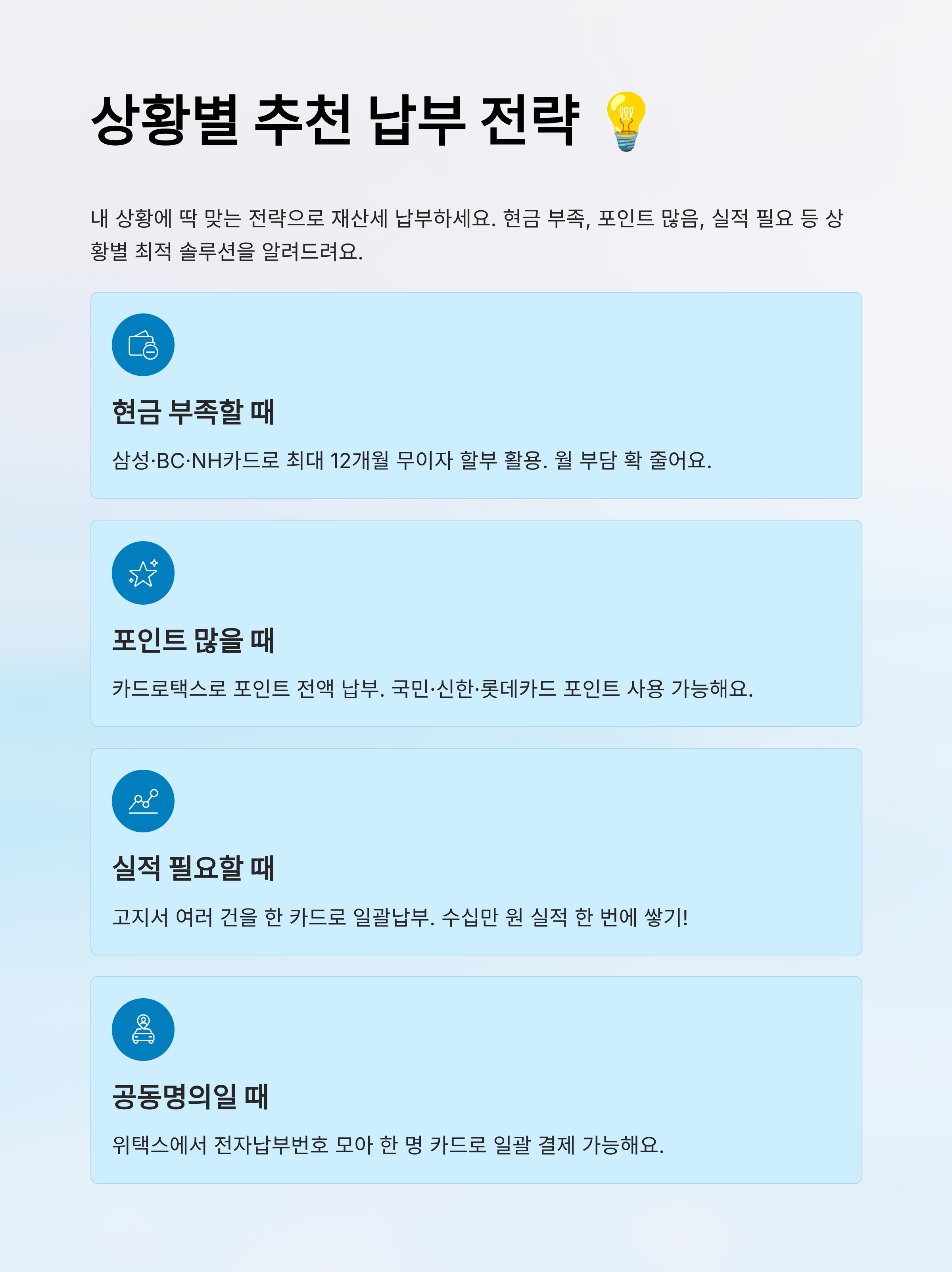 지금부터는 ‘현금이 부족할 때’, ‘포인트가 많을 때’, ‘카드 실적을 모으고 싶을 때’, ‘공동명의일 때’ 등 다양한 상황에 따른 최적의 납부 전략을 알려드릴게요. 실전에서 바로 써먹을 수 있어요!