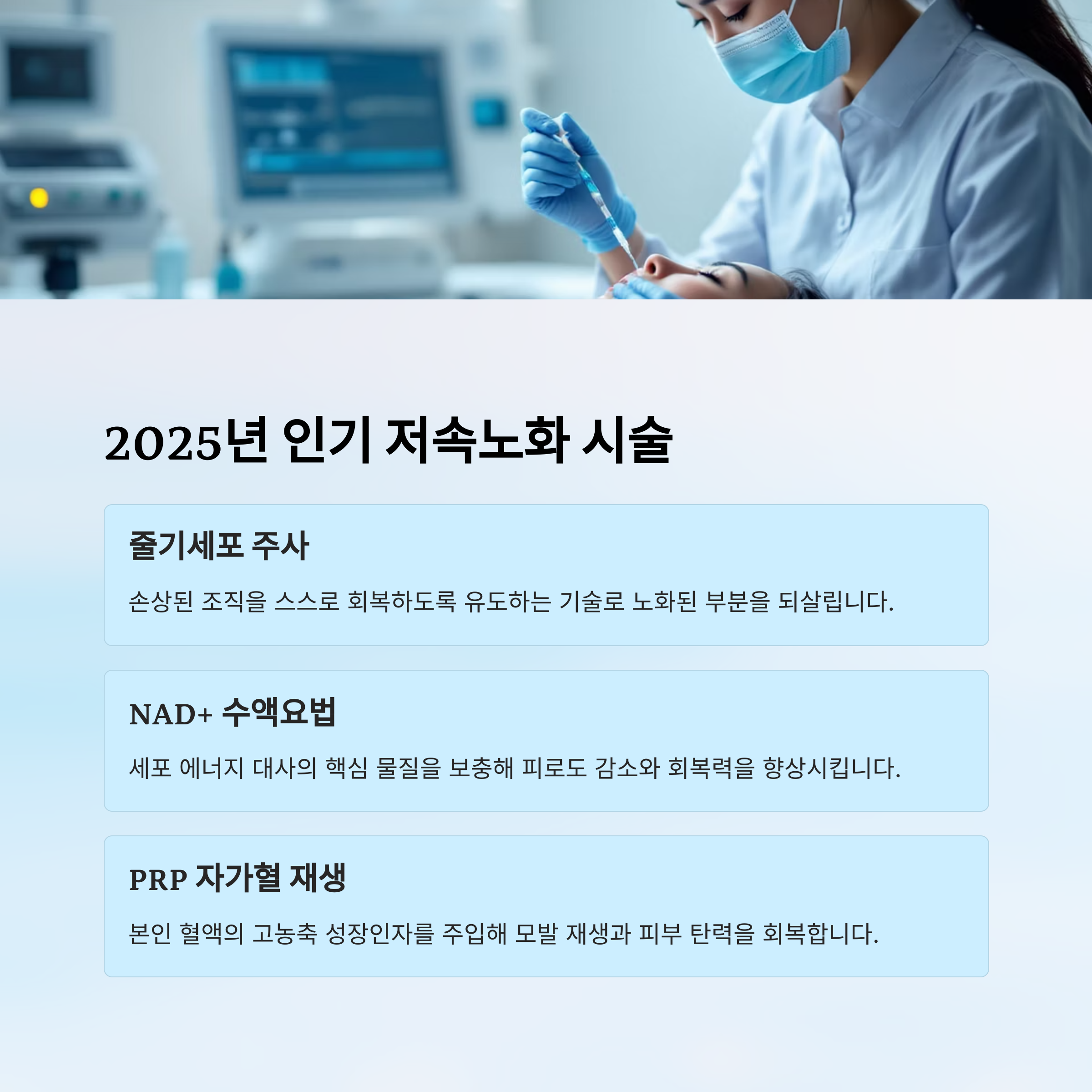 2025년은 특히 저속노화를 위한 의료 기술이 눈부시게 발전한 해예요. 단순 보톡스나 필러 수준을 넘어서 세포 레벨에서 작용하는 줄기세포, 유전자, 호르몬 조절 시술까지 폭넓게 확장되었답니다. 내가 생각했을 때 요즘 트렌드는 단순히 '어려 보이는' 게 아니라, 실제로 젊은 신체 상태를 오래 유지하는 데 있다는 점이에요 🍀
