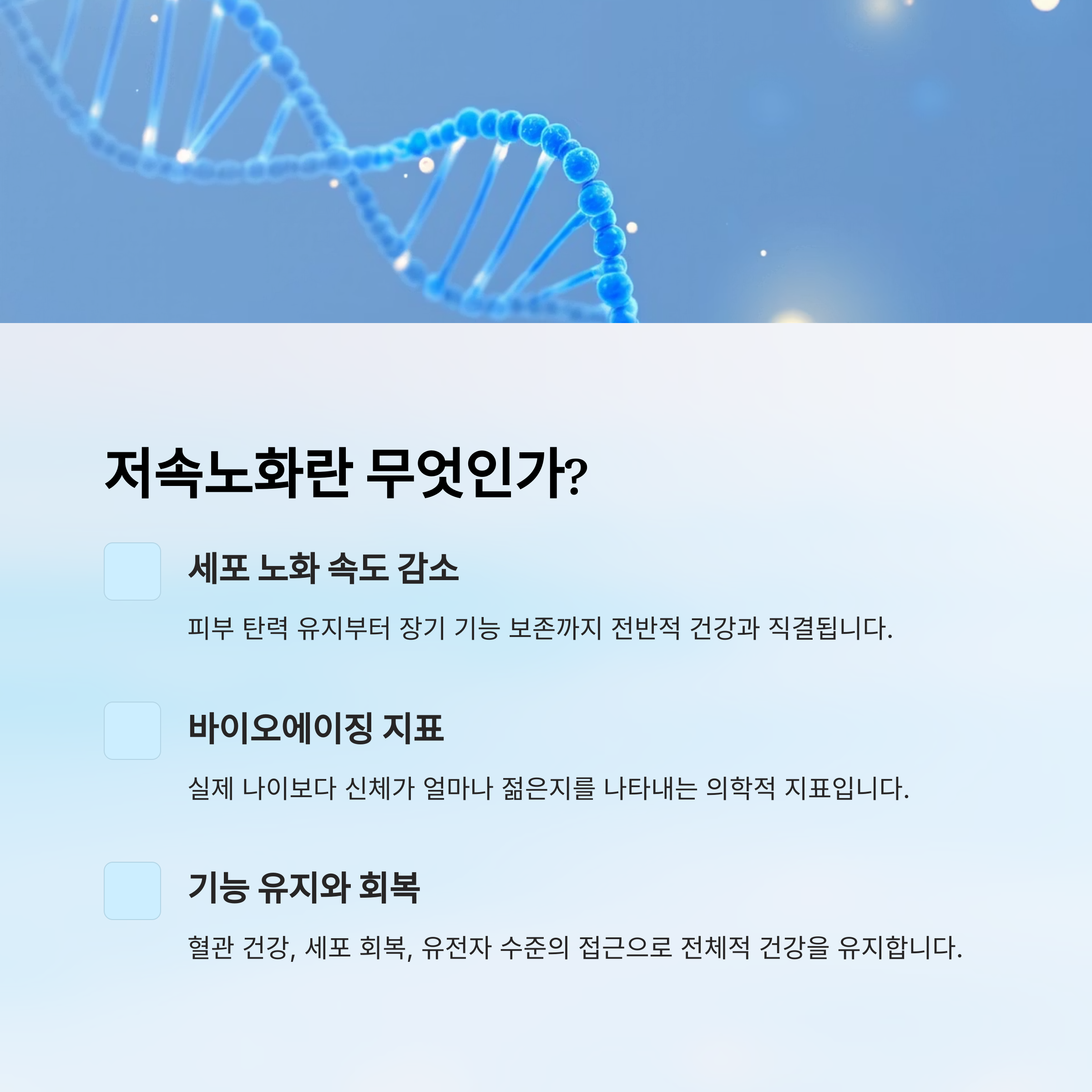 의학에서는 '바이오에이징(Bio-Aging)'이 실제 나이보다 얼마나 신체가 젊은지를 나타내는 지표로 사용되곤 해요. 저속노화 시술은 이 바이오에이징 수치를 낮춰주는데 도움을 주죠. 젊고 건강한 신체 상태를 유지하는 건 단지 외모 때문만이 아니라, 삶의 질을 지키는 핵심 요소로 자리 잡고 있어요.