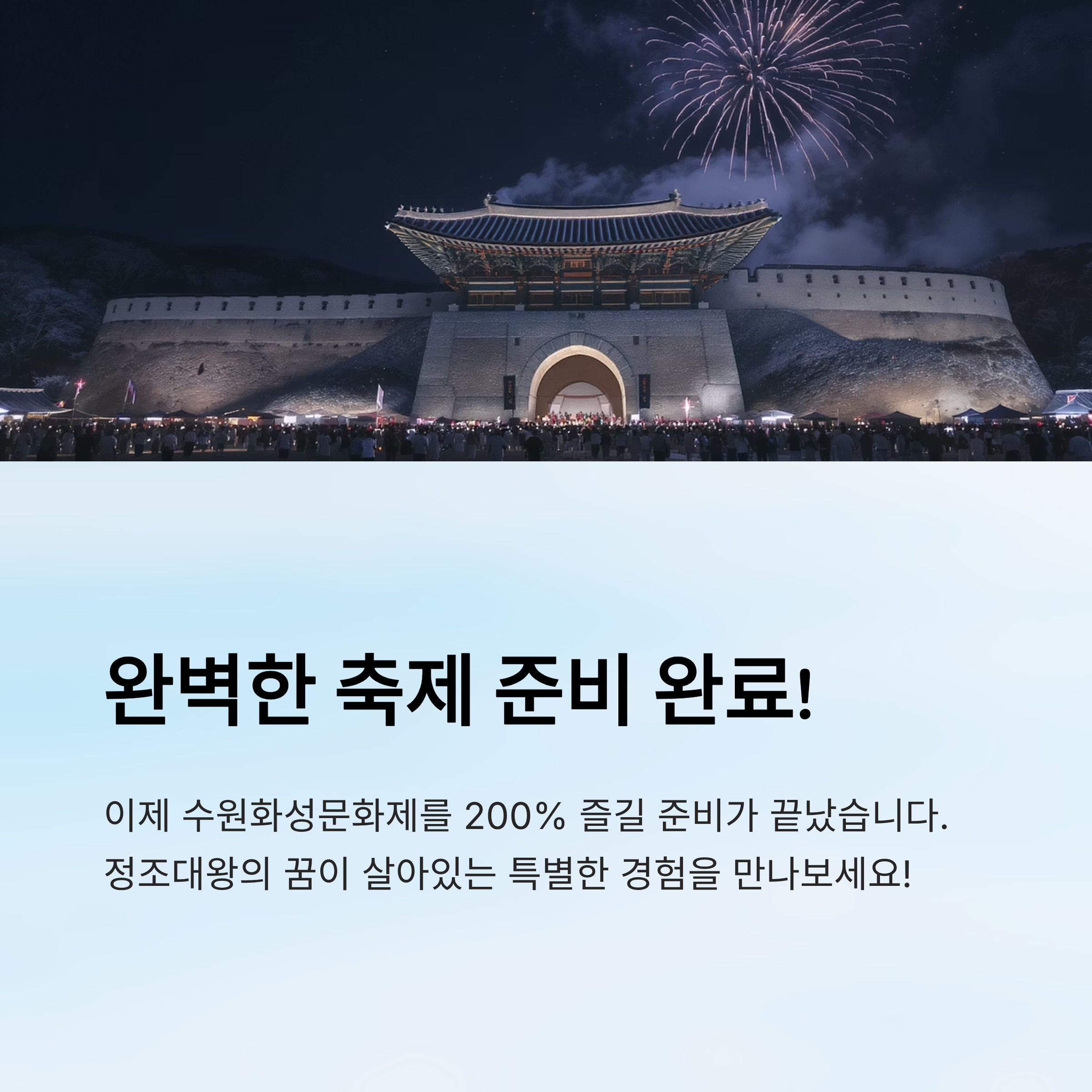 수원화성문화제를 단순히 '보는 축제'로만 느끼지 말고, 한 걸음씩 걸으며 그 뜻과 정성을 느껴보면 더 깊은 감동이 밀려올 거예요.